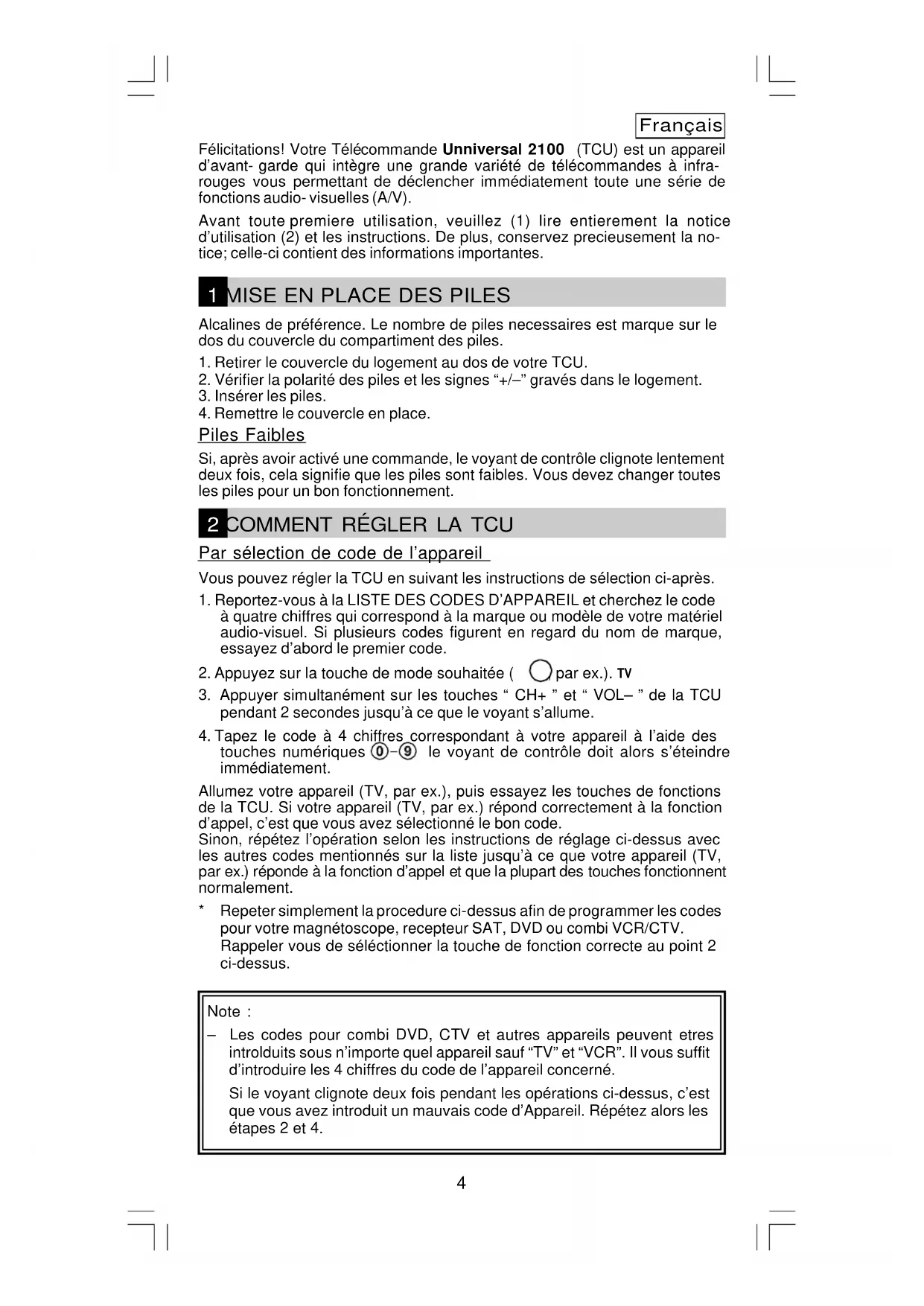 Q. Ma TCU ne marche pas! R. Vérifiez votre appareil audio-visuel. Si l’interrupteur principal de votre appareil est fermé, votre TCU ne peut le faire fonctionner. R. Vérifiez que vos piles sont placées correctement selon les indications “+/-”. R. Verifiez si vous avez selectionné la touche “mode” correspondant à votre appareil. R. Si les piles sont faibles, remplacez-les. Q. Si plusieurs Codes d’Appareil figurent en regard de la marque de mon appareil audio-visuel, que dois-je faire pour sélectionner le bon code d’appareil? R. Pour découvrir le bon code pour votre appareil audio-visuel, essayez les codes un par un jusqu’à ce que la plupart des touches fonctionnent convenablement. Q. Mes appareils audio-visuels répondent seulement à certaines commandes. R. Vous avez choisi un code pour lequel seules certaines des commandes fonctionnent convenablement. Essayez d’autres codes jusqu’à ce que la plupart des touches fonctionnent comme il faut. NOTE: La version anglaise de ce manuel d'instructions fait foi en toutes circonstances. 7Deutsch Wir gratulieren Ihnen zu Ihrem Kauf. Ihre Unniversal 2100 Fernbedienung UFB ist eines der modernsten Geraete dieser Art. Die UFB ermoeglicht Ihnen, verschiedene Audio/Video-Geraete einfach zu handhaben, und dies mit nur einer Fernbedienung. Bevor Sie die Fernbedienung in Betrieb nehmen, lesen Sie bitte ausfuhrlich (1) den Inhalt des Deckblattes und (2) diese Anleitung. Behalten Sie die Anleitung zum Nachschlagen.