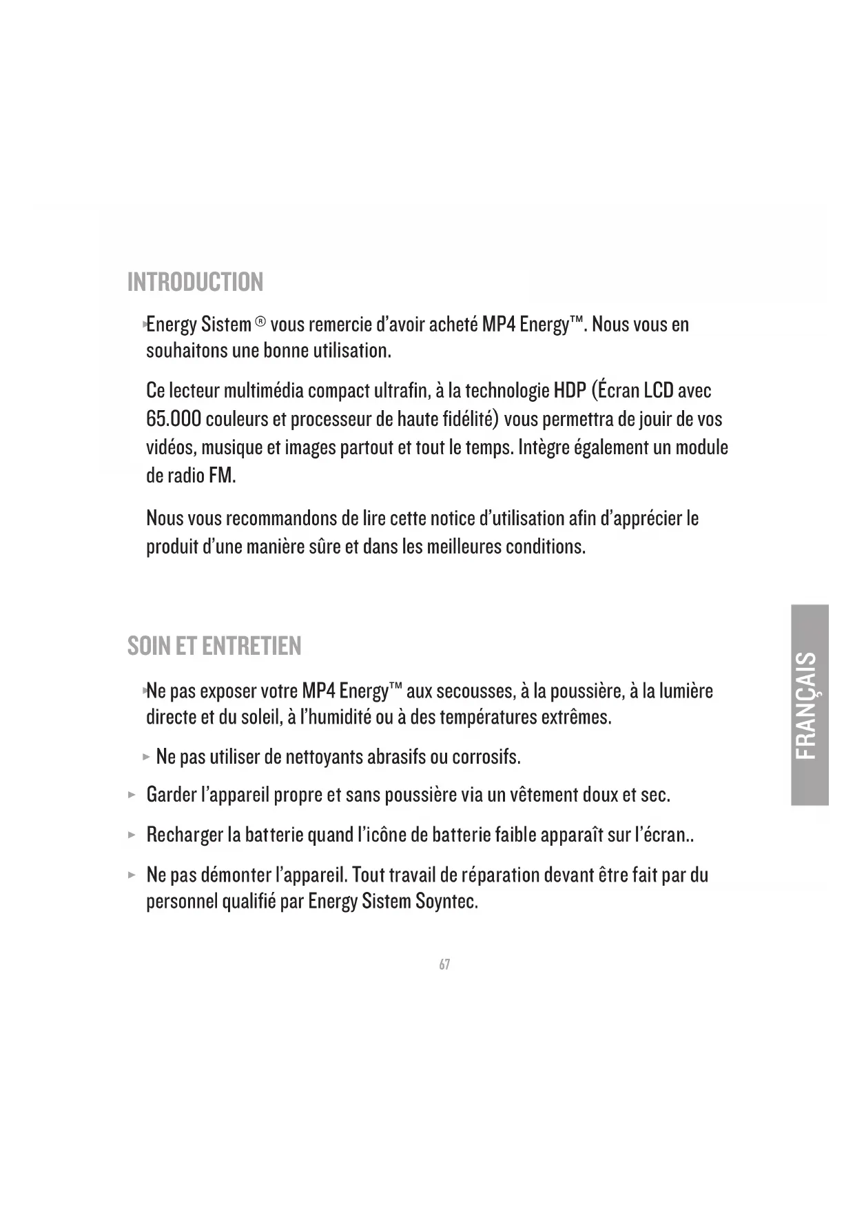 Energy Sistem® vous remercie d'avoir acheté MP4 Energy™. Nous vous en souhaitons une bonne utilisation.