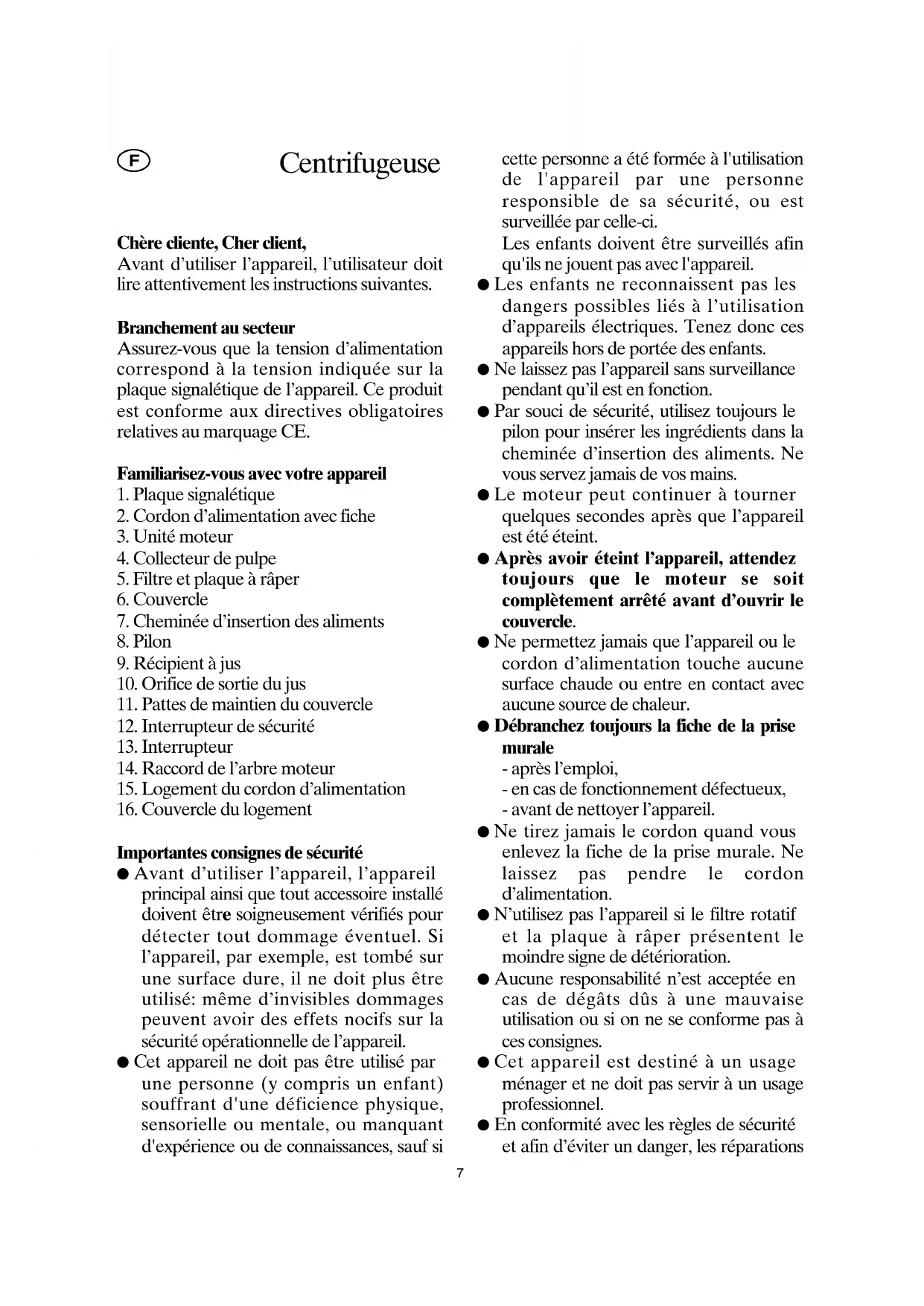 Importantes consignes de sécurité ● Avant d’utiliser l’appareil, l’appareil principal ainsi que tout accessoire installé doivent être soigneusement vérifiés pour détecter tout dommage éventuel. Si l’appareil, par exemple, est tombé sur une surface dure, il ne doit plus être utilisé: même d’invisibles dommages peuvent avoir des effets nocifs sur la sécurité opérationnelle de l’appareil. ● Cet appareil ne doit pas être utilisé par une personne (y compris un enfant) souffrant d'une déficience physique, sensorielle ou mentale, ou manquant d'expérience ou de connaissances, sauf si cette personne a été formée à l'utilisation de l'appareil par une personne responsible de sa sécurité, ou est surveillée par celle-ci. Les enfants doivent être surveillés afin qu'ils ne jouent pas avec l'appareil. ● Les enfants ne reconnaissent pas les dangers possibles liés à l’utilisation d’appareils électriques. Tenez donc ces appareils hors de portée des enfants. ● Ne laissez pas l’appareil sans surveillance pendant qu’il est en fonction. ● Par souci de sécurité, utilisez toujours le pilon pour insérer les ingrédients dans la cheminée d’insertion des aliments. Ne vous servez jamais de vos mains. ● Le moteur peut continuer à tourner quelques secondes après que l’appareil est été éteint. ● Après avoir éteint l’appareil, attendez toujours que le moteur se soit complètement arrêté avant d’ouvrir le couvercle. ● Ne permettez jamais que l’appareil ou le cordon d’alimentation touche aucune surface chaude ou entre en contact avec aucune source de chaleur. ● Débranchez toujours la fiche de la prise murale - après l’emploi, - en cas de fonctionnement défectueux, - avant de nettoyer l’appareil. ● Ne tirez jamais le cordon quand vous enlevez la fiche de la prise murale. Ne laissez pas pendre le cordon d’alimentation. ● N’utilisez pas l’appareil si le filtre rotatif et la plaque à râper présentent le moindre signe de détérioration. ● Aucune responsabilité n’est acceptée en cas de dégâts dûs à une mauvaise utilisation ou si on ne se conforme pas à ces consignes. ● Cet appareil est destiné à un usage ménager et ne doit pas servir à un usage professionnel. ● En conformité avec les règles de sécurité et afin d’éviter un danger, les réparations Centrifugeuse d’appareils électriques doivent être effectuées par du personnel qualifié, y compris le remplacement du cordon d’alimentation. Si une réparation est nécessaire, veuillez envoyer votre appareil à un de nos services après-vente. Leurs adresses sont répertoriées à la fin de ce mode d’emploi. Informations utiles