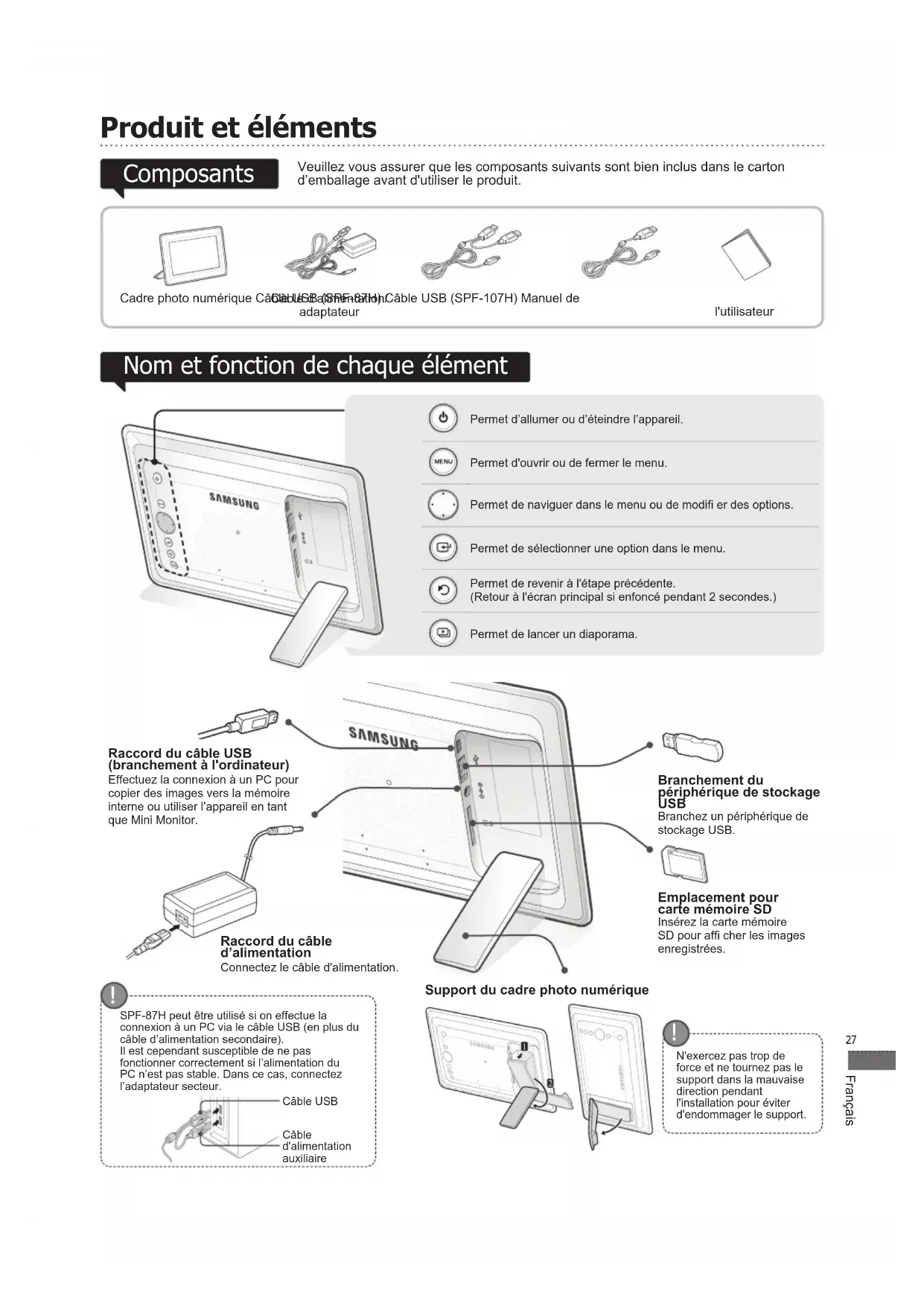(branchement à l'ordinateur) Effectuez la connexion à un PC pour copier des images vers la mémoire interne ou utiliser l’appareil en tant que Mini Monitor. Support du cadre photo numérique N'exercez pas trop de force et ne tournez pas le support dans la mauvaise direction pendant l'installation pour éviter d'endommager le support. SPF-87H peut être utilisé si on effectue la connexion à un PC via le câble USB (en plus du câble d’alimentation secondaire).Il est cependant susceptible de ne pas fonctionner correctement si l’alimentation du PC n’est pas stable. Dans ce cas, connectez l’adaptateur secteur.Câble d'alimentation auxiliaireCâble USB Permet d’allumer ou d’éteindre l’appareil.Permet d'ouvrir ou de fermer le menu.Permet de naviguer dans le menu ou de modi er des options.Permet de sélectionner une option dans le menu.Permet de revenir à l'étape précédente.(Retour à l'écran principal si enfoncé pendant 2 secondes.)Permet de lancer un diaporama. BN68-01567J.indb 27 2009-07-14 �� 3:47:39Français