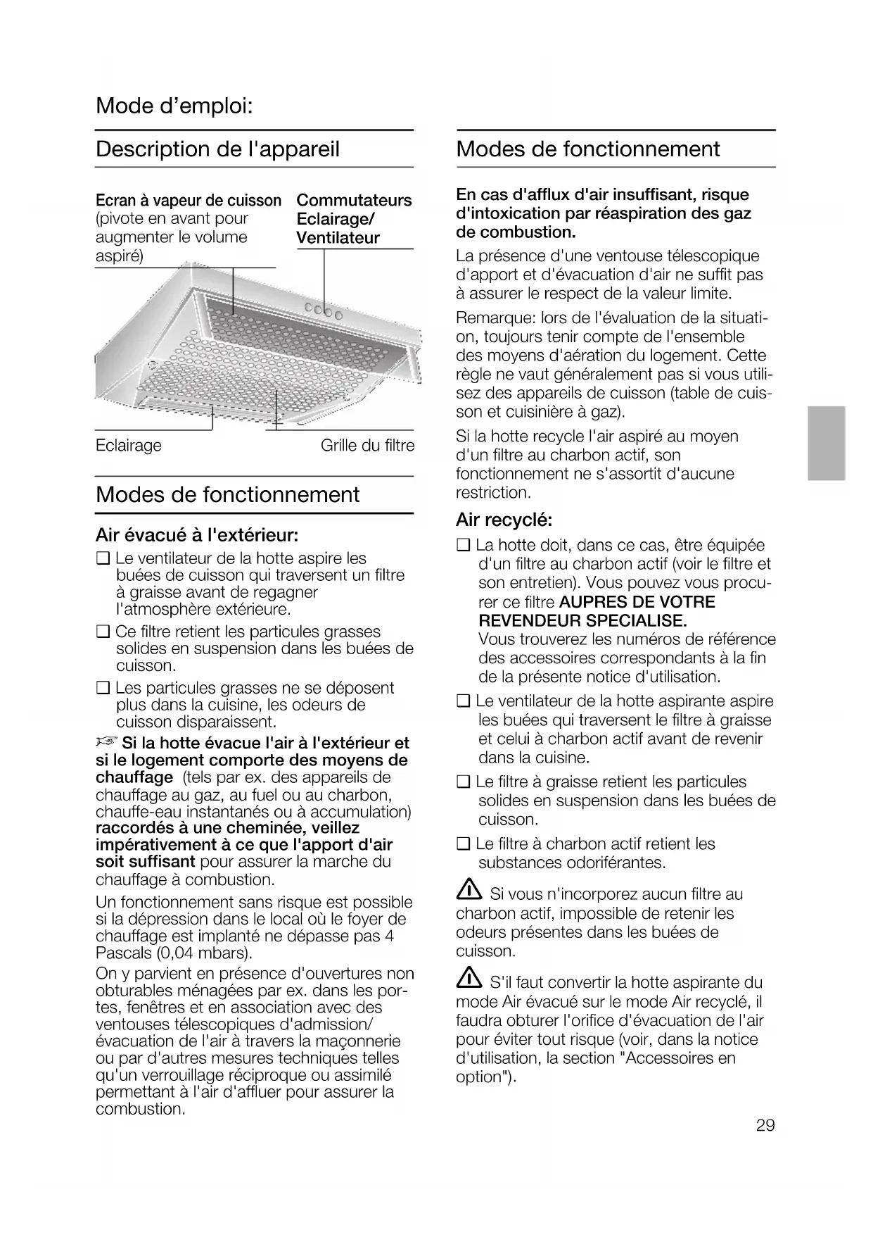 Modes de fonctionnement En cas d'afflux d'air insuffisant, risqued'intoxication par réaspiration des gazde combustion.La présence d'une ventouse télescopiqued'apport et d'évacuation d'air ne suffit pasà assurer le respect de la valeur limite.Remarque: lors de l'évaluation de la situati-on, toujours tenir compte de l'ensembledes moyens d'aération du logement. Cetterègle ne vaut généralement pas si vous utili-sez des appareils de cuisson (table de cuis-son et cuisinière à gaz).Si la hotte recycle l'air aspiré au moyend'un filtre au charbon actif, sonfonctionnement ne s'assortit d'aucunerestriction. Air recyclé: ❑ La hotte doit, dans ce cas, être équipéed'un filtre au charbon actif (voir le filtre etson entretien). Vous pouvez vous procu-rer ce filtre AUPRES DE VOTREREVENDEUR SPECIALISE.Vous trouverez les numéros de référencedes accessoires correspondants à la fin de la présente notice d'utilisation.❑ Le ventilateur de la hotte aspirante aspireles buées qui traversent le filtre à graisseet celui à charbon actif avant de revenirdans la cuisine.❑ Le filtre à graisse retient les particulessolides en suspension dans les buées decuisson.❑ Le filtre à charbon actif retient les substances odoriférantes. Si vous n'incorporez aucun filtre au charbon actif, impossible de retenir lesodeurs présentes dans les buées de cuisson. S'il faut convertir la hotte aspirante du mode Air évacué sur le mode Air recyclé, ilfaudra obturer l'orifice d'évacuation de l'airpour éviter tout risque (voir, dans la noticed'utilisation, la section "Accessoires en option") .