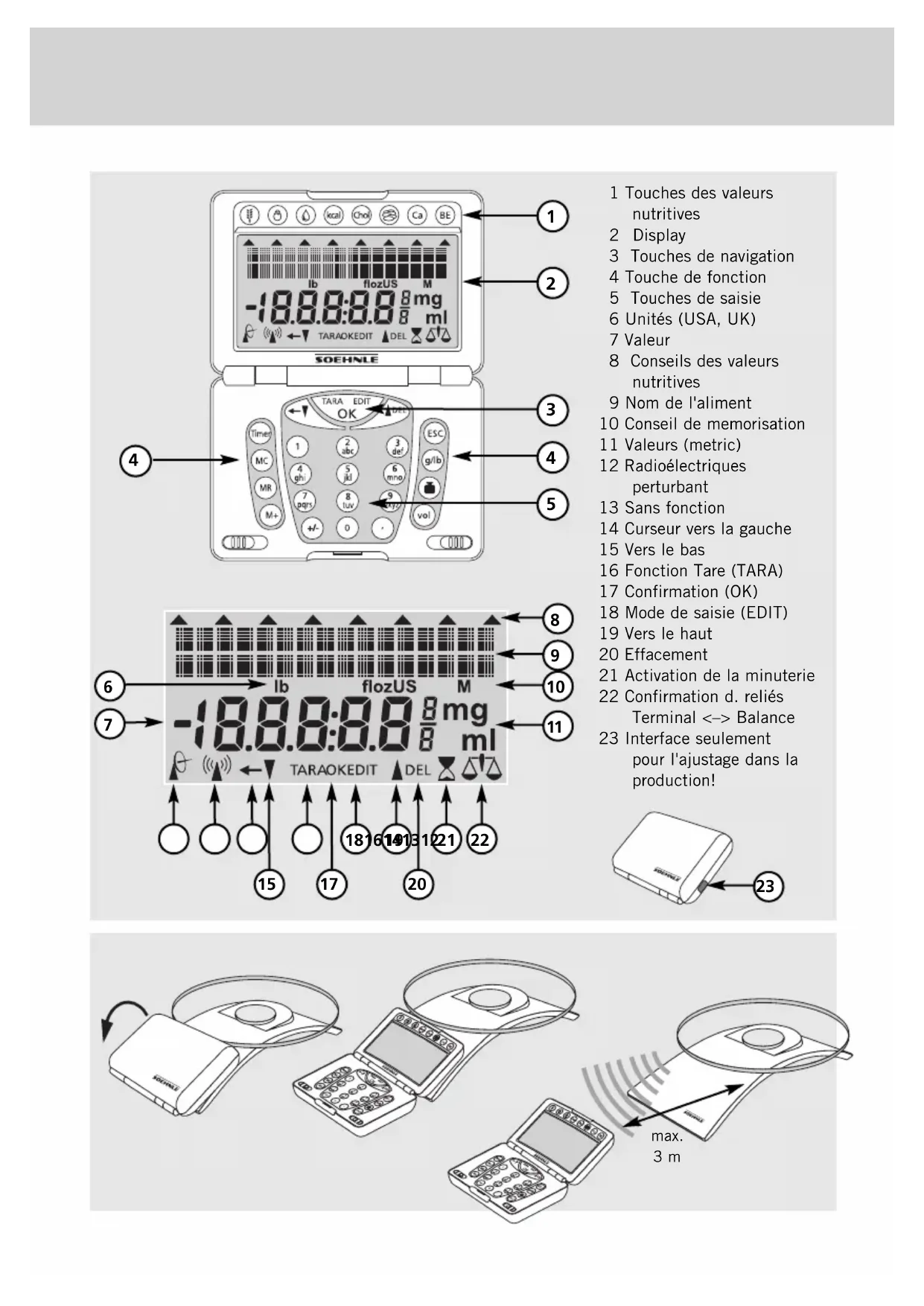 1 Touches des valeurs nutritives 2 Display 3 Touches de navigation 4 Touche de fonction 5 Touches de saisie 6 Unités (USA, UK) 7 Valeur 8 Conseils des valeurs nutritives 9 Nom de l'aliment 10 Conseil de memorisation 11 Valeurs (metric) 12 Radioélectriques perturbant 13 Sans fonction 14 Curseur vers la gauche 15 Vers le bas 16 Fonction Tare (TARA) 17 Confirmation (OK) 18 Mode de saisie (EDIT) 19 Vers le haut 20 Effacement 21 Activation de la minuterie 22 Confirmation d. reliés Terminal <–> Balance 23 Interface seulement pour l'ajustage dans la production! BA65085FCplus121645prn.qxd 19.04.2007 15:56 Uhr Seite 2526