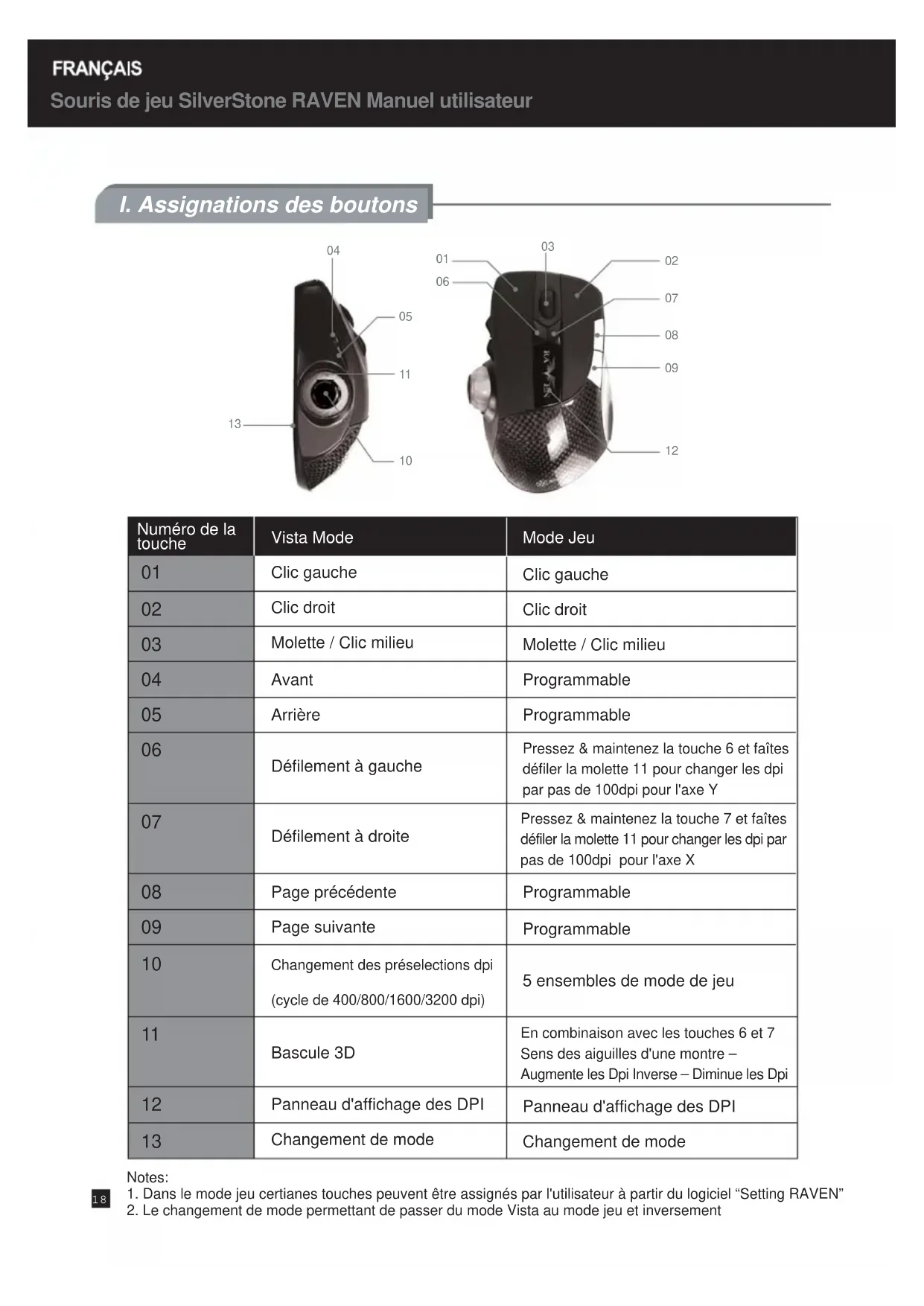 Mode Jeu Clic gauche Clic droit Molette / Clic milieu Programmable Programmable Programmable Programmable 5 ensembles de mode de jeu Panneau d'affichage des DPI Changement de mode Souris de jeu SilverStone RAVEN Manuel utilisateur Numéro de la touche Pressez & maintenez la touche 6 et faîtes défiler la molette 11 pour changer les dpi par pas de 100dpi pour l'axe Y Pressez & maintenez la touche 7 et faîtes défiler la molette 11 pour changer les dpi par pas de 100dpi pour l'axe X En combinaison avec les touches 6 et 7 Sens des aiguilles d'une montre – Augmente les Dpi Inverse – Diminue les Dpi19