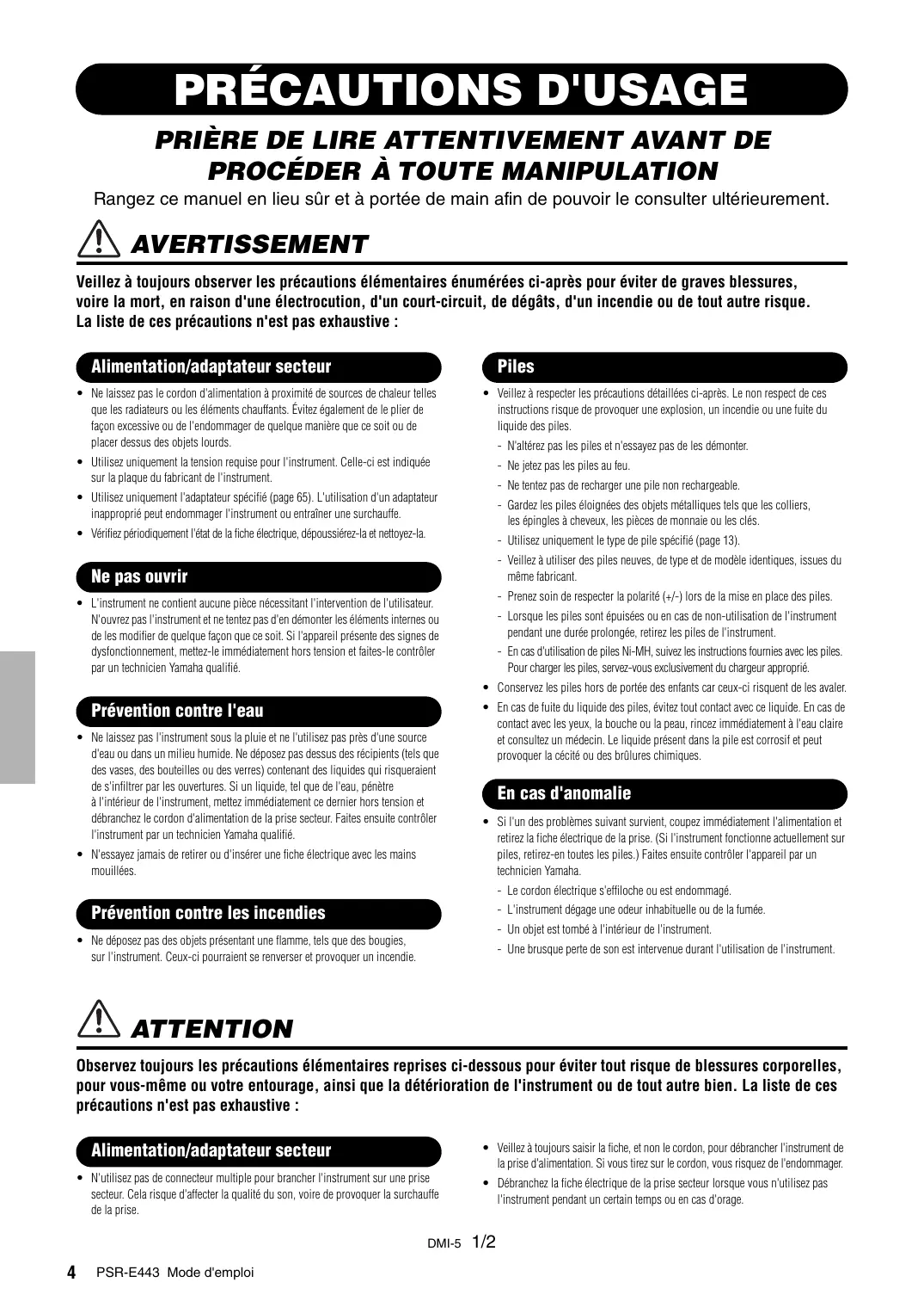 Rangez ce manuel en lieu sûr et à portée de main afin de pouvoir le consulter ultérieurement. AVERTISSEMENT Veillez à toujours observer les précautions élémentaires énumérées ci-après pour éviter de graves blessures, voire la mort, en raison d'une électrocution, d'un court-circuit, de dégâts, d'un incendie ou de tout autre risque. La liste de ces précautions n'est pas exhaustive : Alimentation/adaptateur secteur Piles