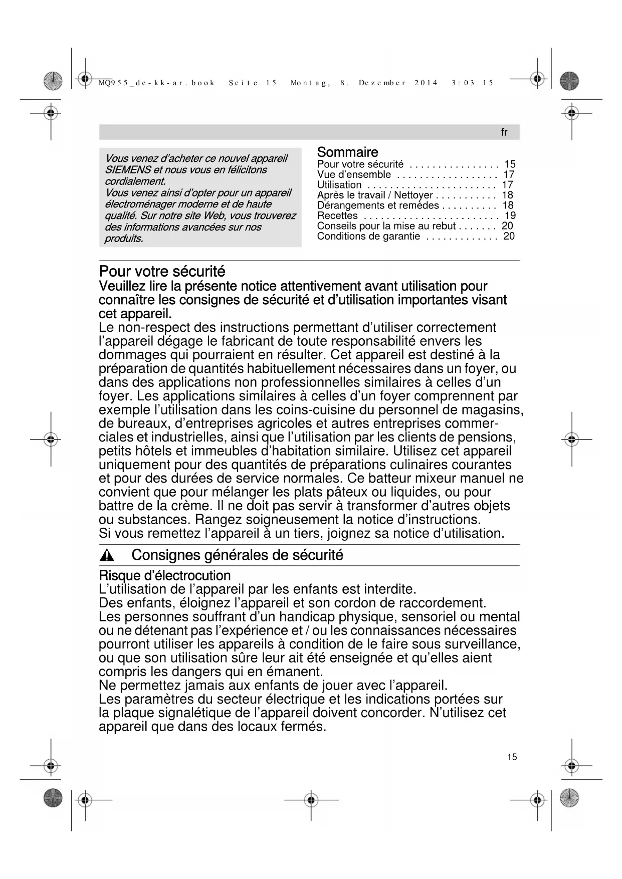 Retrouvez gratuitement la notice de l'appareil MQ95520N SIEMENS au format PDF.