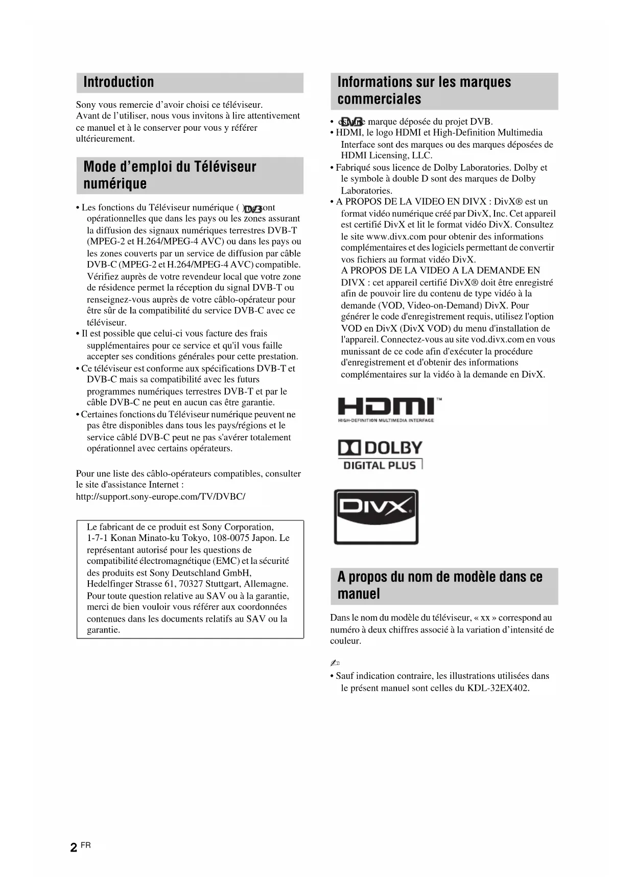 le présent manuel sont celles du KDL-32EX402.