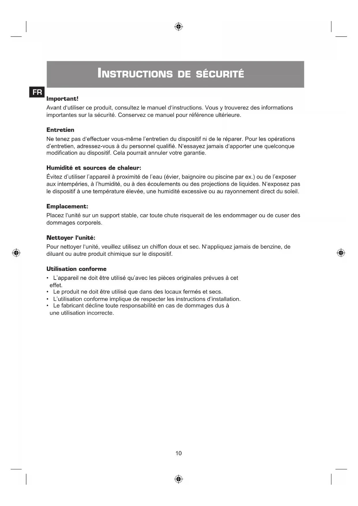 - Le produit ne doit être utilisé que dans des locaux fermés et secs.
