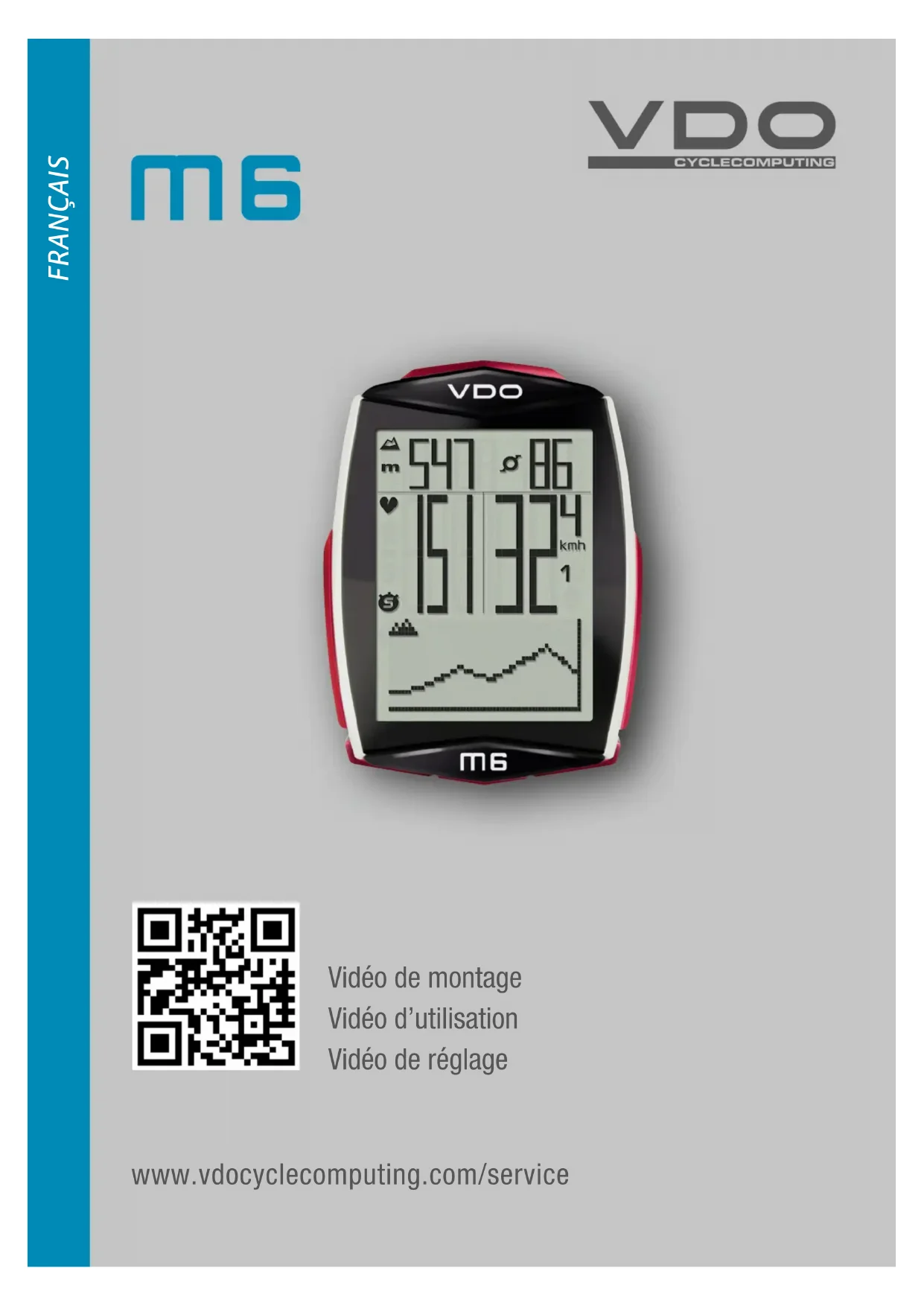 Contrôle de fonctionnement Contrôlez le bon fonctionnement du compteur après le montage. Comment procéder ? – Mettez le compteur en place dans le support. Le chiffre de la vitesse clignote. Le compteur recherche alors son émetteur de vitesse. – Soulevez la roue avant et faites-la tourner. La LED verte de l'émetteur clignote quelques fois. – Une vitesse doit s'afficher sur le compteur. Lorsque l'option “Cadence” est active, l'émetteur de cadence doit également être couplé : – L'affichage de la cadence clignote. Le compteur recherche alors son émetteur de cadence. – Faites tourner le pédalier ou démarrez. La LED verte de l'émetteur de cadence clignote quelques fois. – Une cadence doit alors s'afficher sur le compteur. Lorsque l'option “Fréquence cardiaque” est active, l'émetteur de fréquence cardiaque doit également être couplé : – L'affichage de la fréquence cardiaque clignote. Le compteur recherche alors son émetteur de fréquence cardiaque. – Mettez l'émetteur de fréquence cardiaque en place et attendez quelques secondes. – Une fréquence cardiaque doit alors s'afficher sur le compteur. Si aucune vitesse, cadence ou fréquence cardiaque ne s'affiche, les causes peuvent être multiples. Les causes possibles sont décrites au chapitre “Elimination des défaillances”. Couplage (mise en service) de l'émetteur Le VDO M6 effectue un couplage automatique de l'émetteur. Le compteur commence à rechercher l'émetteur dès qu'il a été tourné dans le support du guidon. La recherche de l'émetteur est visible au clignotement des valeurs de : – Vitesse – Fréquence cardiaque (lorsque l'option est active) – Cadence (lorsque l'option est active) Le VDO M6 est doté d'une fonction de détection automatique du vélo. Les données sont enregistrées pour le vélo 1 ou le vélo 2 selon que vous utilisez le vélo 1 ou le vélo 2. ATTENTION : Si des interférences sont produites par d'autres sources de parasites lors du couplage, l'écran indique “Trop de signaux”. Ce message peut être confirmé avec n'importe quelle touche. Veuillez ensuite quitter le lieu des interférences et vous déplacer à un autre endroit. Retirez le compteur du support du guidon en le faisant tourner. Placez à nouveau le compteur dans le support du guidon. Le compteur procède à un nouveau couplage. Sources de parasites possibles : – Eclairage LED – Téléphone mobile – Récepteur GPS – WLAN – Systèmes antivol des magasins Ces sources de parasites peuvent gêner le couplage. ATTENTION : Dans l'émetteur, l'interrupteur de détection du vélo doit être réglé sur VELO 1 ou VELO 2 lors de la première mise en service. C'est la seule façon pour que le système de détection automatique du vélo fonctionne. MAINTENIR la touche enfoncée jusqu’à ce que la LED clignote. 1 clignotement vert = vélo 1 sélectionné 2 clignotements rouges = vélo 2 sélectionné22