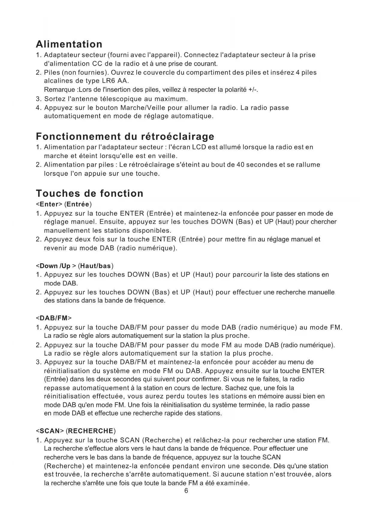 - Appuyez sur la touche DAB/FM pour passer du mode DAB (radio numérique) au mode FM. La radio se règle alors automatiquement sur la station la plus proche.