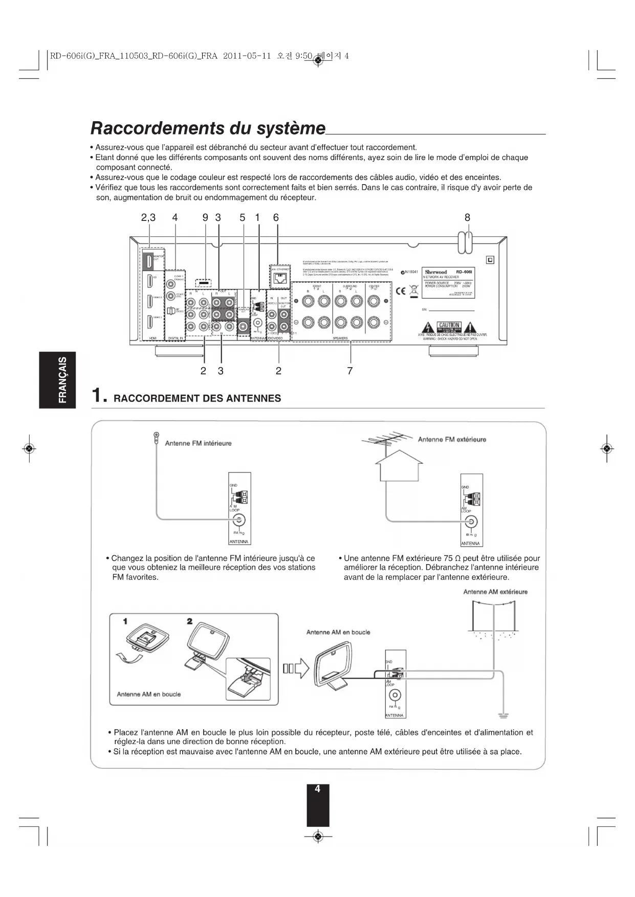 - Vérifiez que tous les raccordements sont correctement faits et bien serrés. Dans le cas contraire, il risque d'y avoir perte de son, augmentation de bruit ou endommagement du récepteur. RD-606i(G)_FRA_110503_RD-606i(G)_FRA 2011-05-11 오전 9:50 페이지 45 FRANÇAIS HDMI