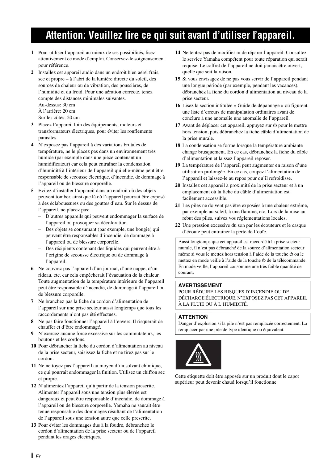 Attention: Veuillez lire ce qui suit avant d’utiliser l’appareil. 1 Pour utiliser l’appareil au mieux de ses possibilités, lisez attentivement ce mode d’emploi. Conservez-le soigneusement pour référence. 2 Installez cet appareil audio dans un endroit bien aéré, frais, sec et propre – à l’abri de la lumière directe du soleil, des sources de chaleur ou de vibration, des poussières, de l’humidité et du froid. Pour une aération correcte, tenez compte des distances minimales suivantes. Au-dessus: 30 cm À l’arrière: 20 cm Sur les côtés: 20 cm 3 Placez l’appareil loin des équipements, moteurs et transformateurs électriques, pour éviter les ronflements parasites. 4 N’exposez pas l’appareil à des variations brutales de température, ne le placez pas dans un environnement très humide (par exemple dans une pièce contenant un humidificateur) car cela peut entraîner la condensation d’humidité à l’intérieur de l’appareil qui elle-même peut être responsable de secousse électrique, d’incendie, de dommage à l’appareil ou de blessure corporelle. 5 Evitez d’installer l’appareil dans un endroit où des objets peuvent tomber, ainsi que là où l’appareil pourrait être exposé à des éclaboussures ou des gouttes d’eau. Sur le dessus de l’appareil, ne placez pas: – D’autres appareils qui peuvent endommager la surface de l’appareil ou provoquer sa décoloration. – Des objets se consumant (par exemple, une bougie) qui peuvent être responsables d’incendie, de dommage à l’appareil ou de blessure corporelle. – Des récipients contenant des liquides qui peuvent être à l’origine de secousse électrique ou de dommage à l’appareil. 6 Ne couvrez pas l’appareil d’un journal, d’une nappe, d’un rideau, etc. car cela empêcherait l’évacuation de la chaleur. Toute augmentation de la température intérieure de l’appareil peut être responsable d’incendie, de dommage à l’appareil ou de blessure corporelle. 7 Ne branchez pas la fiche du cordon d’alimentation de l’appareil sur une prise secteur aussi longtemps que tous les raccordements n’ont pas été effectués. 8 Ne pas faire fonctionner l’appareil à l’envers. Il risquerait de chauffer et d’être endommagé. 9 N’exercez aucune force excessive sur les commutateurs, les boutons et les cordons. 10 Pour débrancher la fiche du cordon d’alimentation au niveau de la prise secteur, saisissez la fiche et ne tirez pas sur le cordon. 11 Ne nettoyez pas l’appareil au moyen d’un solvant chimique, ce qui pourrait endommager la finition. Utilisez un chiffon sec et propre. 12 N’alimentez l’appareil qu’à partir de la tension prescrite. Alimenter l’appareil sous une tension plus élevée est dangereux et peut être responsable d’incendie, de dommage à l’appareil ou de blessure corporelle. Yamaha ne saurait être tenue responsable des dommages résultant de l’alimentation de l’appareil sous une tension autre que celle prescrite. 13 Pour éviter les dommages dus à la foudre, débranchez le cordon d’alimentation de la prise secteur ou de l’appareil pendant les orages électriques.
