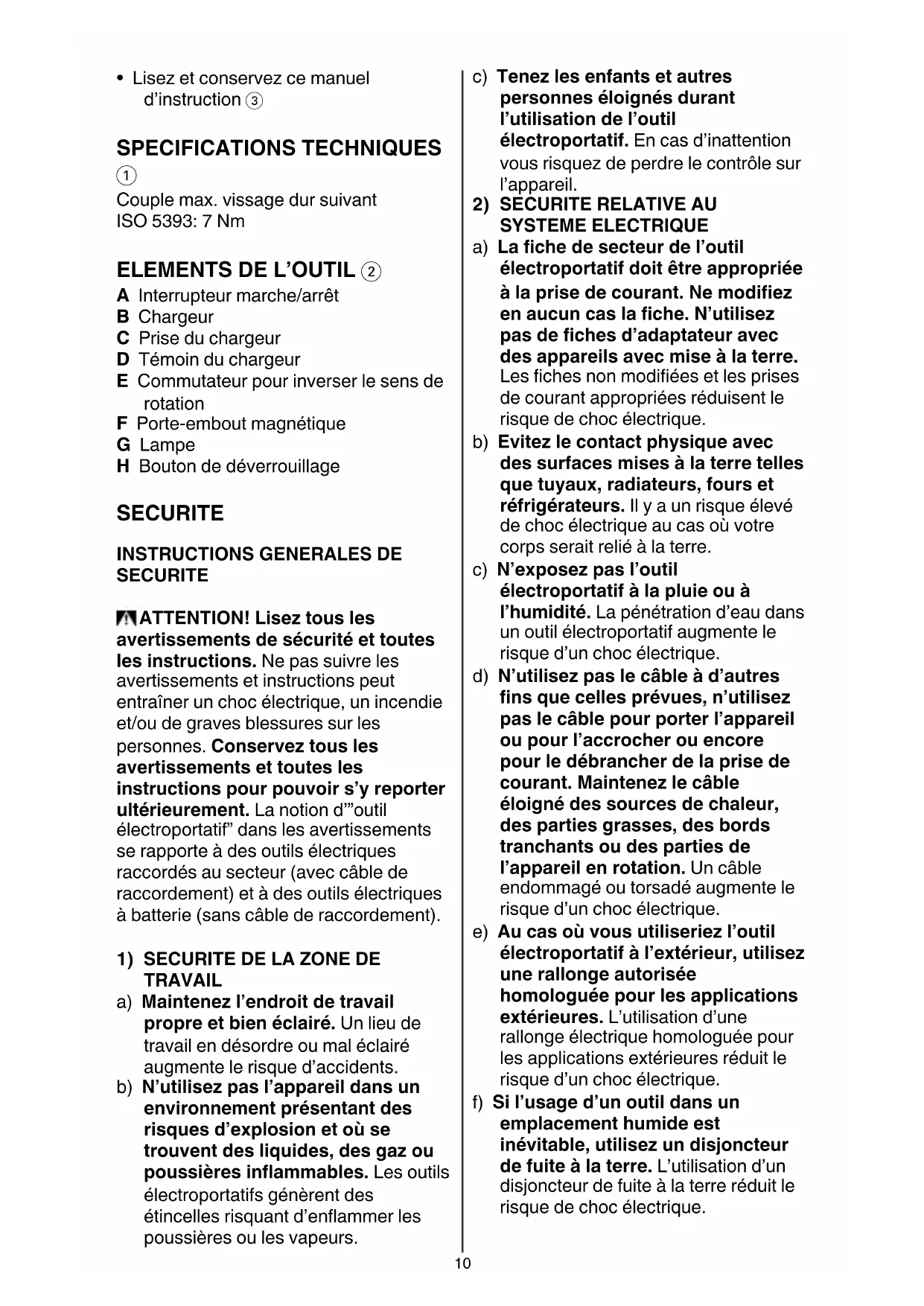 A Interrupteur marche/arrêt B Chargeur C Prise du chargeur D Témoin du chargeur E Commutateur pour inverser le sens de rotation F Porte-embout magnétique G Lampe H Bouton de déverrouillage SECURITE