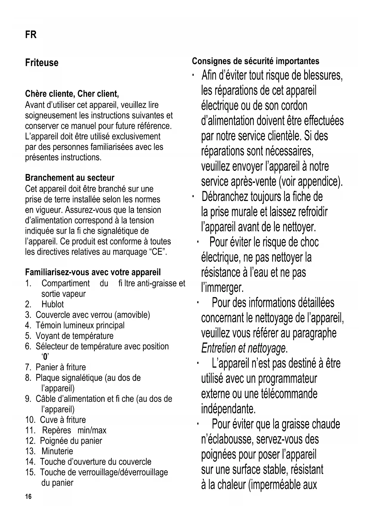du panier Consignes de sécurité importantes ∙ A fi n d’éviter tout risque de blessures, les réparations de cet appareil électrique ou de son cordon d’alimentation doivent être effectuées par notre service clientèle. Si des réparations sont nécessaires, veuillez envoyer l’appareil à notre service après-vente (voir appendice). ∙ Débranchez toujours la fi che de la prise murale et laissez refroidir l’appareil avant de le nettoyer. ∙ Pour éviter le risque de choc électrique, ne pas nettoyer la résistance à l’eau et ne pas l’immerger. ∙ Pour des informations détaillées concernant le nettoyage de l’appareil, veuillez vous référer au paragraphe Entretien et nettoyage. ∙ L’appareil n’est pas destiné à être utilisé avec un programmateur externe ou une télécommande indépendante. ∙ Pour éviter que la graisse chaude n’éclabousse, servez-vous des poignées pour poser l’appareil sur une surface stable, résistant à la chaleur (imperméable aux FR17 éclaboussures et aux tâches et qui dispose de suffi samment d’espace).