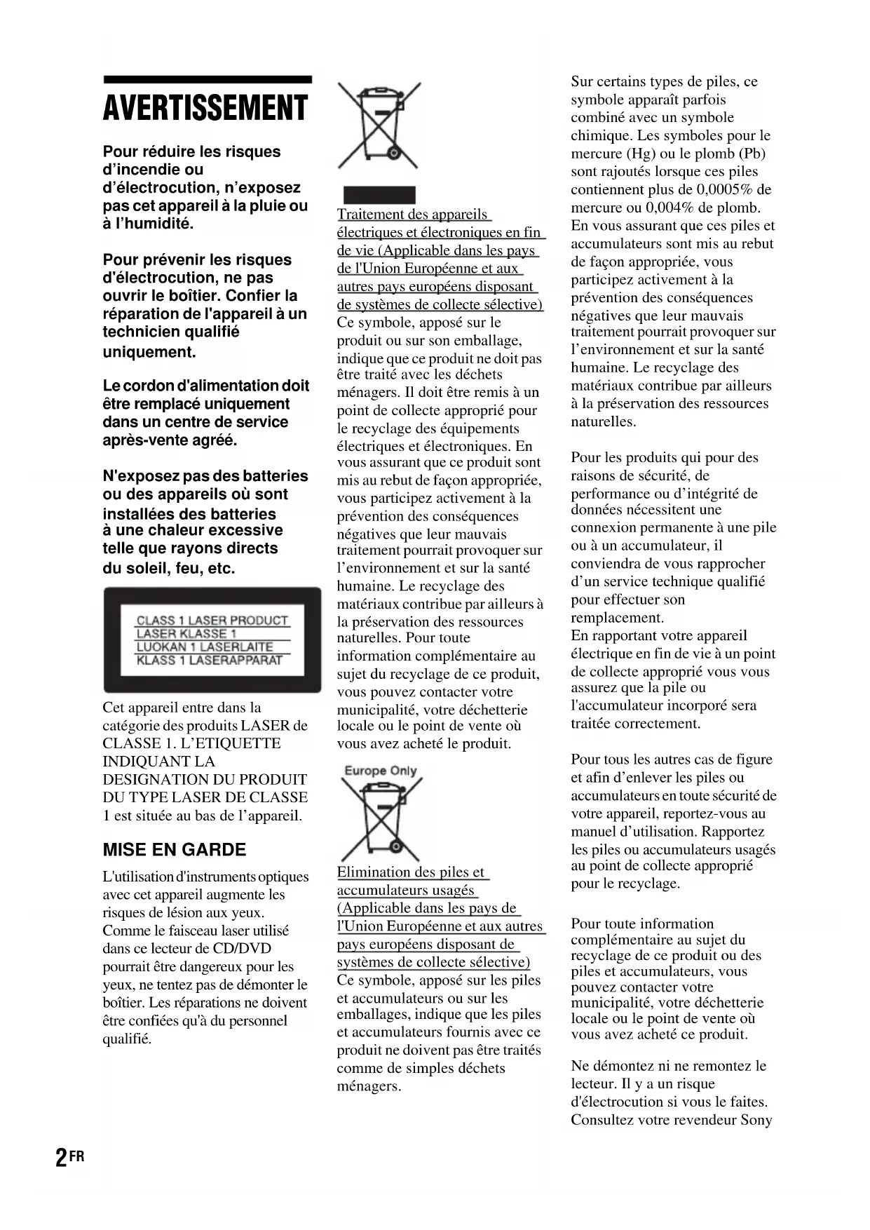 L'utilisation d'instruments optiques avec cet appareil augmente les risques de lésion aux yeux. Comme le faisceau laser utilisé dans ce lecteur de CD/DVD pourrait être dangereux pour les yeux, ne tentez pas de démonter le boîtier. Les réparations ne doivent être confiées qu'à du personnel qualifié. Traitement des appareils électriques et électroniques en fin de vie (Applicable dans les pays de l'Union Européenne et aux autres pays européens disposant de systèmes de collecte sélective) Ce symbole, apposé sur le produit ou sur son emballage, indique que ce produit ne doit pas être traité avec les déchets ménagers. Il doit être remis à un point de collecte approprié pour le recyclage des équipements électriques et électroniques. En vous assurant que ce produit sont mis au rebut de façon appropriée, vous participez activement à la prévention des conséquences négatives que leur mauvais traitement pourrait provoquer sur l’environnement et sur la santé humaine. Le recyclage des matériaux contribue par ailleurs à la préservation des ressources naturelles. Pour toute information complémentaire au sujet du recyclage de ce produit, vous pouvez contacter votre municipalité, votre déchetterie locale ou le point de vente où vous avez acheté le produit. Elimination des piles et accumulateurs usagés (Applicable dans les pays de l'Union Européenne et aux autres pays européens disposant de systèmes de collecte sélective) Ce symbole, apposé sur les piles et accumulateurs ou sur les emballages, indique que les piles et accumulateurs fournis avec ce produit ne doivent pas être traités comme de simples déchets ménagers. Sur certains types de piles, ce symbole apparaît parfois combiné avec un symbole chimique. Les symboles pour le mercure (Hg) ou le plomb (Pb) sont rajoutés lorsque ces piles contiennent plus de 0,0005% de mercure ou 0,004% de plomb. En vous assurant que ces piles et accumulateurs sont mis au rebut de façon appropriée, vous participez activement à la prévention des conséquences négatives que leur mauvais traitement pourrait provoquer sur l’environnement et sur la santé humaine. Le recyclage des matériaux contribue par ailleurs à la préservation des ressources naturelles. Pour les produits qui pour des raisons de sécurité, de performance ou d’intégrité de données nécessitent une connexion permanente à une pile ou à un accumulateur, il conviendra de vous rapprocher d’un service technique qualifié pour effectuer son remplacement. En rapportant votre appareil électrique en fin de vie à un point de collecte approprié vous vous assurez que la pile ou l'accumulateur incorporé sera traitée correctement. Pour tous les autres cas de figure et afin d’enlever les piles ou accumulateurs en toute sécurité de votre appareil, reportez-vous au manuel d’utilisation. Rapportez les piles ou accumulateurs usagés au point de collecte approprié pour le recyclage. Pour toute information complémentaire au sujet du recyclage de ce produit ou des piles et accumulateurs, vous pouvez contacter votre municipalité, votre déchetterie locale ou le point de vente où vous avez acheté ce produit. Ne démontez ni ne remontez le lecteur. Il y a un risque d'électrocution si vous le faites. Consultez votre revendeur Sony 010COV.book Page 2 Thursday, February 9, 2012 11:34 AMDVP-FX780 4-411-681-21(1)