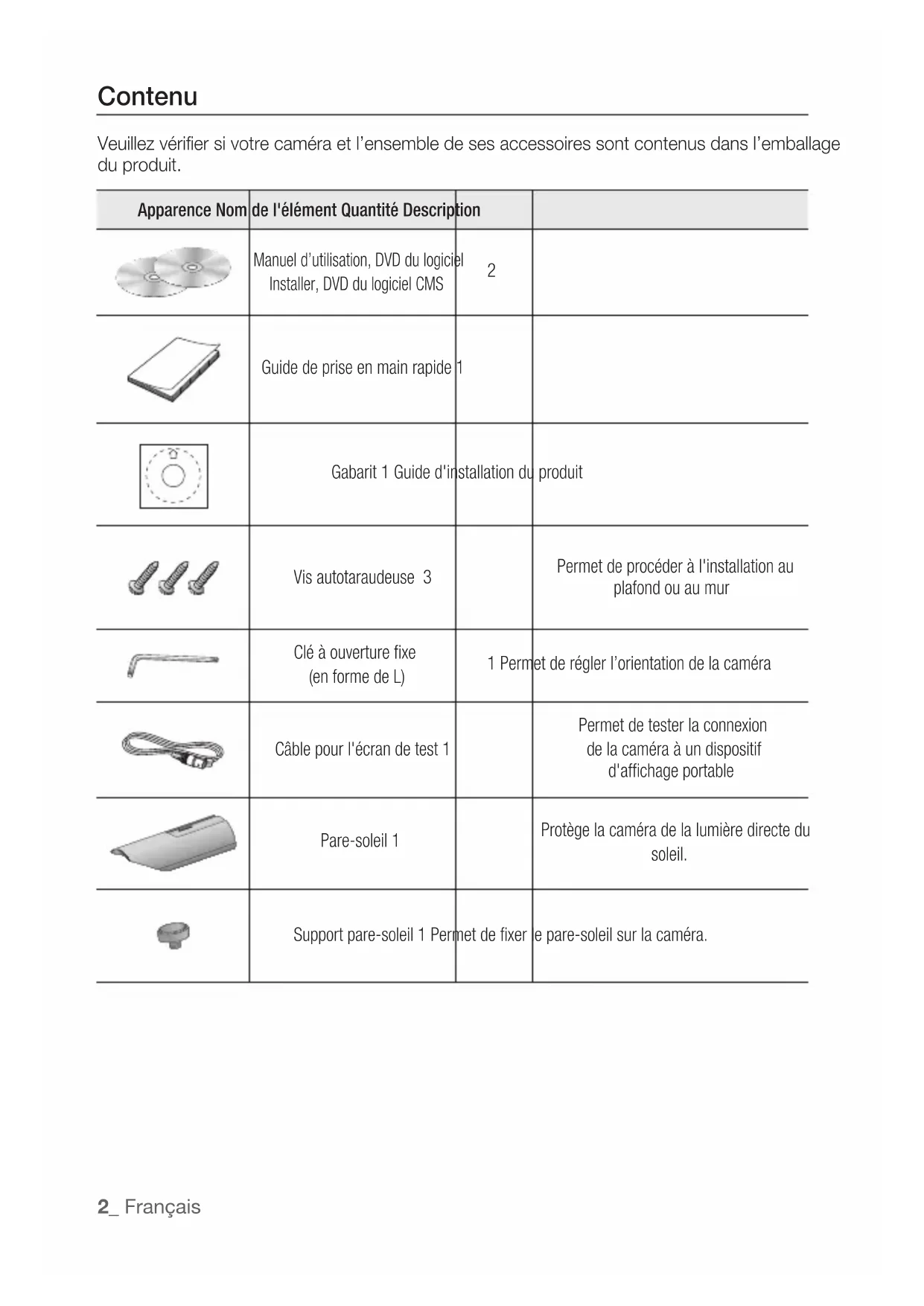 Veuillez vérifier si votre caméra et l’ensemble de ses accessoires sont contenus dans l’emballage