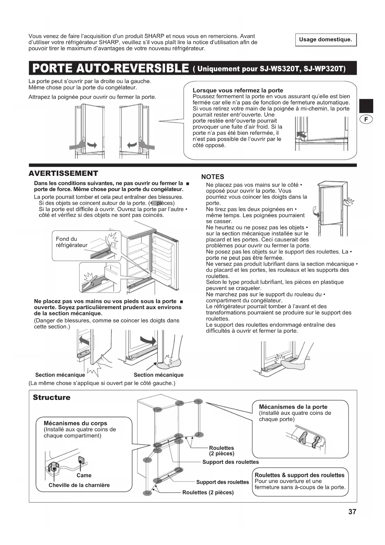PRIMA DI CHIAMARE IL SERVIZIO DI ASSISTENZA AVVERTENZE Innanzi tutto rimuovere la spina del frigorifero dalla ■presa di rete in modo da prevenire le scosse elettriche.Non versare dell’acqua direttamente sull’esterno ■o nell’interno del frigorifero stesso. Ciò potrebbe causare l’ossidazione e il danneggiamento dell’isolamento elettrico. IMPORTANTE Per evitare che le superci interne e i componenti in plastica si incrinino, fare uso dei seguenti suggerimenti.Pulire qualsiasi olio alimentare attaccato ai componenti in • plastica.Alcuni prodotti chimici per la pulizia della casa potrebbero • arrecare danni; usare quindi solamente detersivo per piatti diluito (acqua saponata).Se viene usato un detersivo non diluito oppure non viene • eliminata completamente l’acqua saponata, le parti in plastica potrebbero incrinarsi. Rimuovere gli accessori, per esempio i ripiani, dal frigorifero e dalla porta. Lavateli in acqua calda saponata. Sciacquateli in acqua fresca e asciugateli. (Solo il ripiano per frutta e verdura non è rimovibile). Pulite l’interno del frigorifero con un panno precedentemente immerso in acqua e sapone. Quindi, adoperate acqua fredda per eliminare l’acqua saponata. Detergete con un panno umido anche l’esterno ogni qualvolta ció fosse necessario. Detergete la guarnizione magnetica della porta con uno spazzolino da denti e con acqua calda saponata. Pulire il pannello di controllo con un panno asciutto. NOTA Per evitare danni al frigorifero, non utilizzare detergenti forti o • solventi (lacca, vernice, detergente in polvere, benzina, acqua bollente ecc.).Se l’alimentazione dovesse essere interrotta, attendere • almeno 5 minuti prima di ricollegare alla rete elettrica il frigorifero.I ripiani di vetro pesano circa 2kg ciascuno. Quando • li rimuovete dal frigorifero o li trasportate, manteneteli saldamente. Quando del succo o un liquido simile viene versato vicino al • pannello di controllo, rimuoverlo direttamente, poiché può causare il malfunzionamento del pannello di controllo.All’ interno del frigorifero non lasciate cadere oggetti • né colpite le pareti, in quanto ciò potrebbe creare delle spaccature. Scongelamento Lo scongelamento avviene in maniera completamente automatica grazie ad un sistema di recupero energetico unico. Quando la lampadina del comparto è bruciata Contattare un centro di assistenza approvato da SHARP per richiedere una luce di ricambio per il comparto. La luce del comparto deve essere rimossa solo da personale qualicato. Spegnimento del Vostro frigorifero Se spegnete il vostro frigorifero quando siete assenti per un periodo più o meno lungo, rimuovete tutti i cibi e pulite completamente l’interno. Togliete il cavo di alimentazione elettrica dalla presa di corrente e lasciate tutte e due le porte aperte.Prima di chiamare il servizio di assistenza controllate i seguenti punti. Problema Soluzione La parte esterna del frigorifero risulta calda quando viene toccata. Questo è normale. Nei frigoriferi è situato un tubo caldo per prevenire la formazione di condensa.Il frigorifero emette rumore. É normale che il frigorifero produca i seguenti rumori. Forte rumore prodotto dal compressore quando sta avviandosi a funzionare. Il rumore • si attenua dopo un momento. Forte rumore prodotto una volta al giorno dal compressore. Rumore prodotto • immediatamente dopo l’operazione automatica di disgelamento. Rumore della circolazione del uido (rumore di gorgoqlio e rumore di liquido che “frizza”) • --- Rumore del refrigerante che ricircola nelle tubazioni. Rumore di scricchiolio, squittio • --- Rumore prodotto dall’espansione e contrazione delle pareti interne e delle parti interne durante il congelamento.Si forma della condensa o del ghiaccio sulle parti interne o esterne del frigorifero. Ciò può vericarsi in uno dei seguenti casi. Utilizzare un panno umido per rimuovere il ghiaccio e un panno asciutto per rimuovere la condensa.Quando l’umidità dell’ambiente è elevata.• Quando la porta viene aperta e chiusa spesso.• Quando vengono conservati prodotti alimentari molto umidi. (È necessario un involucro).• I prodotti alimentari nel comparto frigorifero si congelano. Il frigorifero funziona per lungo tempo con controllo temp. frigorifero impostato su 0 °C?• Il frigorifero funziona per lungo tempo con controllo temp. freezer impostato su -21 °C?• Una bassa temperatura della stanza può causare il congelamento dei cibi conservati • anche se il controllo temp. frigorifero é impostato a 6 °C.Nel comparto c’è un odore sgradevole. È necessario un involucro per i prodotti alimentari con un odore forte.• L’unità di deodorizzazione non è in grado di rimuovere tutti i cattivi odori.• SE É ANCORA NECESSARIO IL SERVIZIO DI ASSISTENZA Rivolgetevi al più vicino centro di assistenza approvato da SHARP. (B107)_BOOK-W.indb 36 2010/09/28 14:47:1037 Usage domestique. AVERTISSEMENT Dans les conditions suivantes, ne pas ouvrir ou fermer la ■ porte de force. Même chose pour la porte du congélateur. La porte pourrait tomber et cela peut entraîner des blessures. Si des objets se coincent autour de la porte. (• pièces) Si la porte est difcile à ouvrir. Ouvrez la porte par l’autre • côté et vériez si des objets ne sont pas coincés. Ne placez pas vos mains ou vos pieds sous la porte ■ ouverte. Soyez particulièrement prudent aux environs de la section mécanique. (Danger de blessures, comme se coincer les doigts dans cette section.) NOTES Ne placez pas vos mains sur le côté • opposé pour ouvrir la porte. Vous pourriez vous coincer les doigts dans la porte. Ne tirez pas les deux poignées en • même temps. Les poignées pourraient se casser. Ne heurtez ou ne posez pas les objets • sur la section mécanique installée sur le placard et les portes. Ceci causerait des problèmes pour ouvrir ou fermer la porte. Ne posez pas les objets sur le support des roulettes. La • porte n