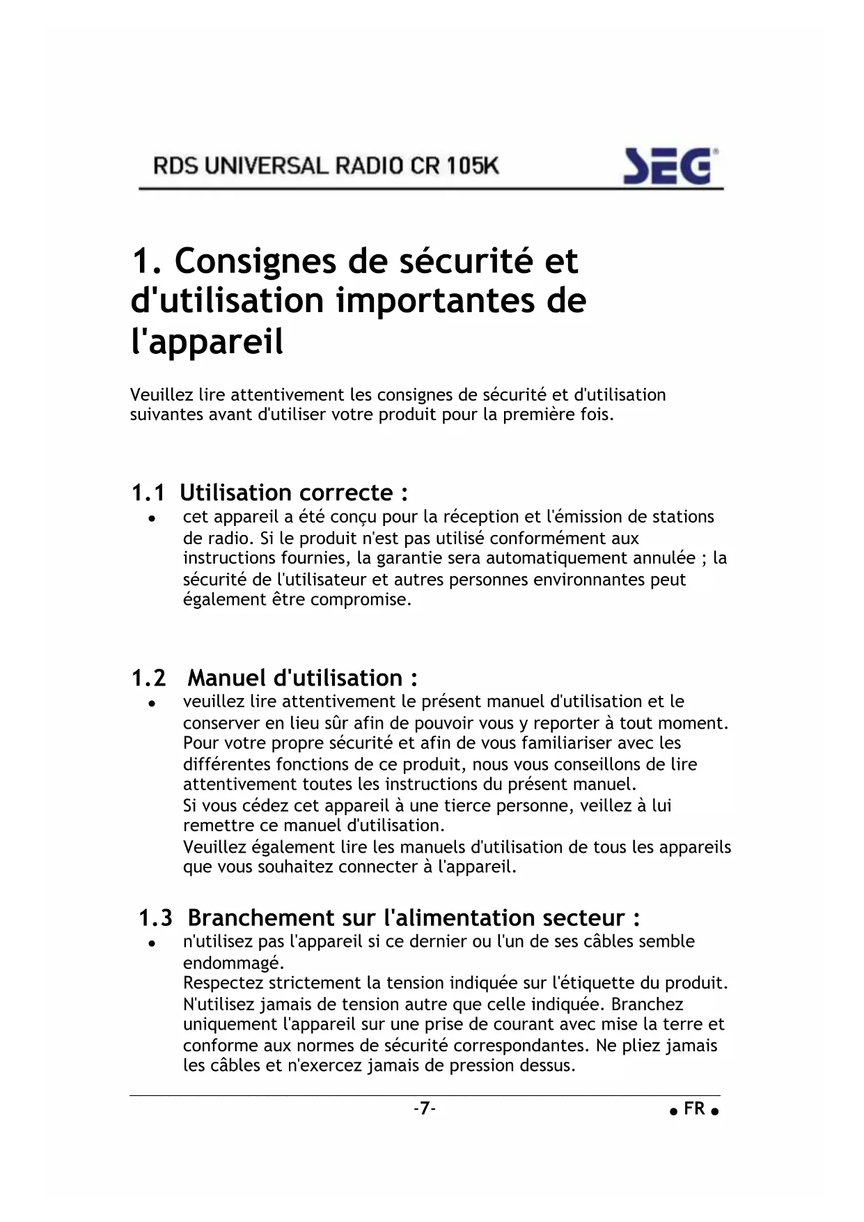Téléchargez la notice de votre Radio au format PDF gratuitement ! Retrouvez votre notice CR 105K - SEG et reprennez votre appareil électronique en main. Sur cette page sont publiés tous les documents nécessaires à l'utilisation de votre appareil CR 105K de la marque SEG.