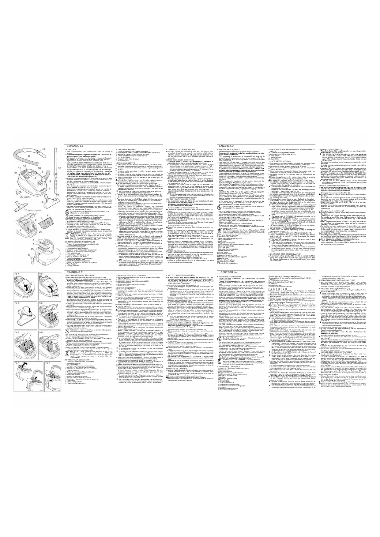 ) Si vous aspirez une grande quantité de poussière fine, par exemple : poussière provenant d’une perceuse, de sable, de plâtreou de farine, les pores du sac s'obtureront. À ce stade, ilconviendra de remplacer le sac parce que l'obturation des poresréduit la puissance d'aspiration.REMPLACEMENT DU SAC À POUSSIÈRE (3)• Lorsque l’indicateur (6) est complètement rouge, le sac en papier doitêtre substitué. Quelques fois, l'indicateur peut se mettre au rouge à cause d'un objetcoincé dans le tuyau ou dans un accessoire. Pour savoir si c’est le cas,débranchez l'aspirateur, retirez le tuyau et branchez à nouveaul'aspirateur. Si l'indicateur ne se met pas au rouge, nettoyez le tuyau et sonaccessoire.1 Lorsque vous aurez besoin de remplacer le sac en papier, débranchezl'aspirateur et procédez comme suit :2 Ouvrez le sac à poussières de l'aspirateur en appuyant sur la languette(1) et en relevant le couvercle. (fig. 1)3 Le sac en papier possède une fermeture hygiénique de l’orifice d’entréepour garantir une hygiène maximale. En retirant le sac, maintenez-lefortement par les côtés et tirez le carton central vers le haut. (fig. 4) 4 Introduisez le nouveau sac en papier dans l'accessoire de support du sacà poussières (22). Veillez à ce que la flèche du bord inférieur du sac soitsituée vers le bas et vérifiez que le bord en carton du sac se trouve àl’intérieur du guide de l’accessoire porte-sac de poussière (22). Faitesalors glisser le sac jusqu’en fin de course du guide de l’accessoire (22)(fig. 5). Il est très important que le sac soit bien positionné. Afin de vous enassurer, vérifiez le bord en carton du sac. Il doit coïncider avec l’orificed’entrée d’air de l’aspirateur.NETTOYAGE ET REMPLACEMENT DES FILTRES ) Il est recommandé de contrôler les filtres à air régulièrement afin de vérifier qu’ils fonctionnent correctement.Effectuez un nettoyage des filtres si vous détectez une diminutionde la capacité d’aspiration de l’appareil.Remplacement du filtre de protection du moteur (9) n Débranchez toujours l’aspirateur avant de nettoyer ou de changer les filtres.1 Lorsque le filtre de protection du moteur (9) est sale (1 ou 2 fois par an,en fonction de l'utilisation de l'aspirateur), ouvrez l'aspirateur, retirez lesac à poussières et retirez le filtre en tirant sur la partie supérieure de cedernier (fig.6).2 Secouez bien le filtre de protection ou lavez-le s'il est très sale et laissez-le bien sécher. ) Important : N’utilisez jamais l’aspirateur dans le filtre de protection du moteur ou s’il n’est pas complètement sec.Remplacement du filtre de sortie d'air (7) n Débranchez toujours l’aspirateur avant de nettoyer ou de changer les filtres.1 Le filtre de sortie d'air (7) devra également être nettoyé 1 ou 2 fois paran. Retirez le cache du filtre de sortie d’air (7), en appuyant sur la partiesupérieure du bouton d’ouverture du cache (8) jusqu’à entendre un clic(fig. 7) et retirez le filtre.2 Secouez bien le filtre de protection (12) ou lavez-le s'il est très sale et laissez-le bien sécher. N'utilisez jamais l'aspirateur sans le filtre de sortie d'air.3 Remettez le filtre et le couvercle à leur place. Pour cela, soulevez lapoignée de transport (21) et faites coïncider les languettes du couvercledu filtre de sortie d’air avec les logements situés sur la partie supérieurede l’aspirateur ; appuyez vers le bas du bouton d’ouverture du cache dufiltre (8) jusqu’à entendre un clic (fig. 8).NETTOYAGE DE L’APPAREIL ) Nettoyez l’appareil avant la première utilisation, immédiatement après chaque utilisation et après une longue période d’inutilisation. Vousassurerez ainsi un fonctionnement correct de celui-ci et prolongerez sadurée de vie utile. n Avant de nettoyer l’appareil, débranchez-le du secteur. n Assurez-vous qu’il n’y ait pas d’eau à entrer dans l’appareil. 1 Nettoyez l'extérieur de l'appareil avec un chiffon humide. N’utilisez pasde dissolvants ni de produits abrasifs. DEUTSCH de 1 SICHERHEITSHINWEISE