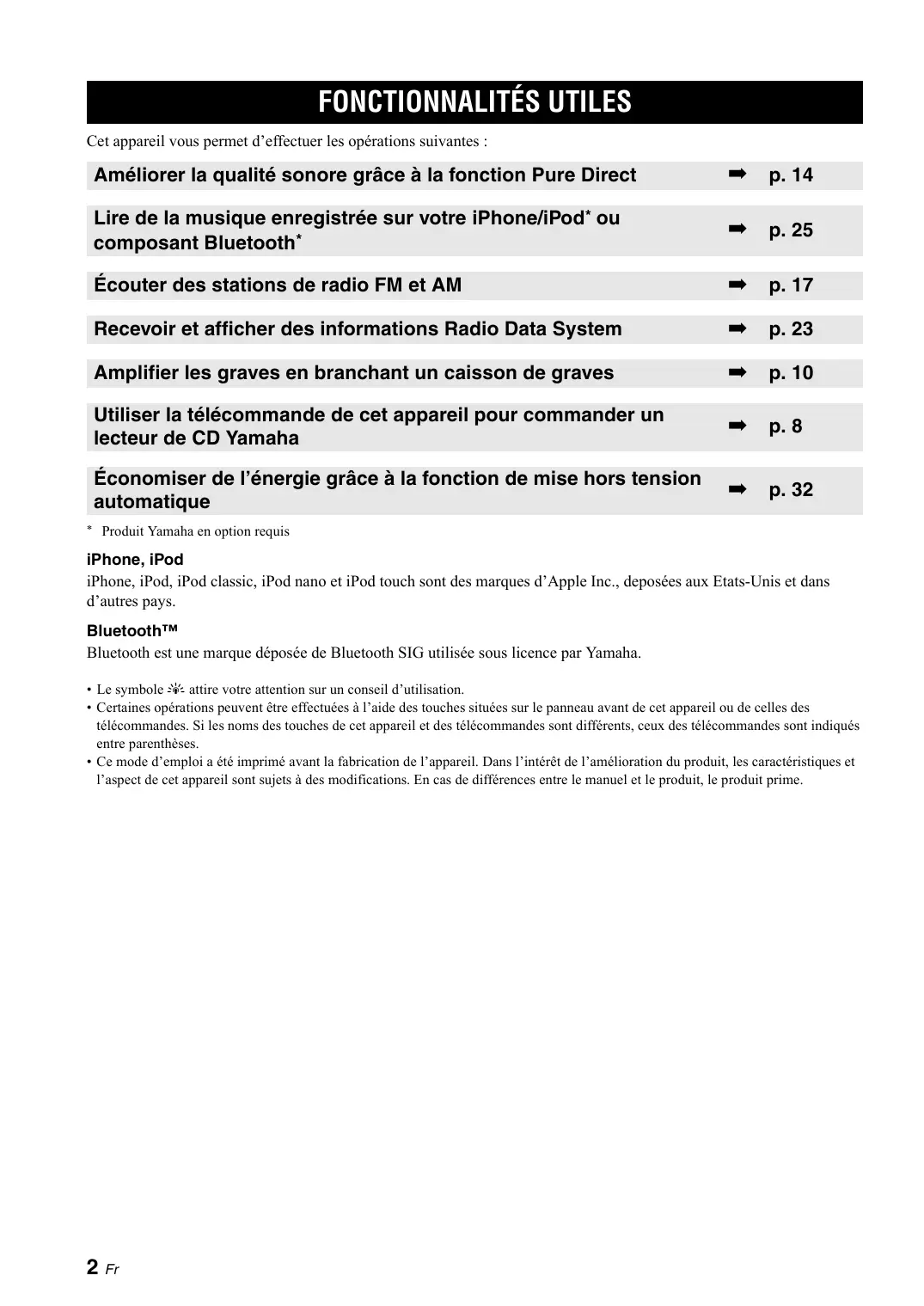 Bluetooth™ Bluetooth est une marque déposée de Bluetooth SIG utilisée sous licence par Yamaha. • Le symbole y attire votre attention sur un conseil d’utilisation. • Certaines opérations peuvent être effectuées à l’aide des touches situées sur le panneau avant de cet appareil ou de celles des télécommandes. Si les noms des touches de cet appareil et des télécommandes sont différents, ceux des télécommandes sont indiqués entre parenthèses. • Ce mode d’emploi a été imprimé avant la fabrication de l’appareil. Dans l’intérêt de l’amélioration du produit, les caractéristiques et l’aspect de cet appareil sont sujets à des modifications. En cas de différences entre le manuel et le produit, le produit prime.