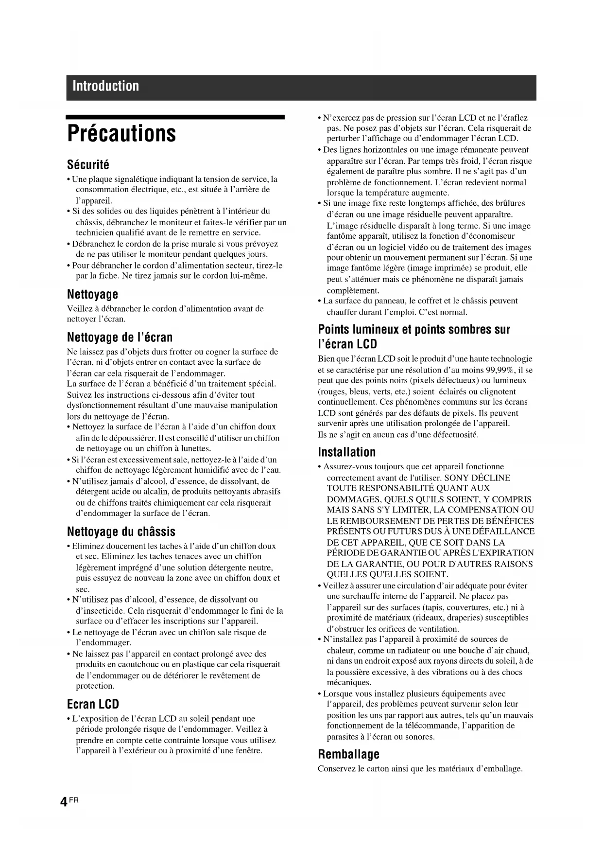 AVERTISSEMENT Afin de réduire les risques d’incendie ou d’électrocution, ne pas exposer cet appareil à la pluie ou à l’humidité. Afin d’écarter tout risque d’électrocution, garder le coffret fermé. Ne confier l’entretien de l’appareil qu’à un personnel qualifié. AVERTISSEMENT CET APPAREIL DOIT ÊTRE RELIÉ À LA TERRE. Transport Lorsque que vous transportez l’écran, tenez le par l’appareil lui même et non par les haut parleurs. Dans le cas contraire, ces derniers peuvent se détacher et l’appareil risque de tomber. Ceci pourrait entraîner des blessures. AVERTISSEMENT Lors de l’installation de l’appareil, incorporer un dispositif de coupure dans le câblage fixe ou brancher la fiche d’alimentation dans une prise murale facilement accessible proche de l’appareil. En cas de problème lors du fonctionnement de l’appareil, enclencher le dispositif de coupure d’alimentation ou débrancher la fiche d’alimentation. Pour les clients au Canada Cet appareil numérique de la classe B est conforme à la norme NMB-003 du Canada. Pour les clients en Europe Le fabricant de ce produit est Sony Corporation, 1-7-1 Konan, Minato-ku, Tokyo, 108-0075 Japon. Le représentant autorisé pour EMC et la sécurité des produits est Sony Deutschland GmbH, Hedelfinger Strasse 61, 70327 Stuttgart, Allemagne. Pour toute question concernant le service ou la garantie, veuillez consulter les adresses indiquées dans les documents de service ou de garantie séparés. AVERTISSEMENT