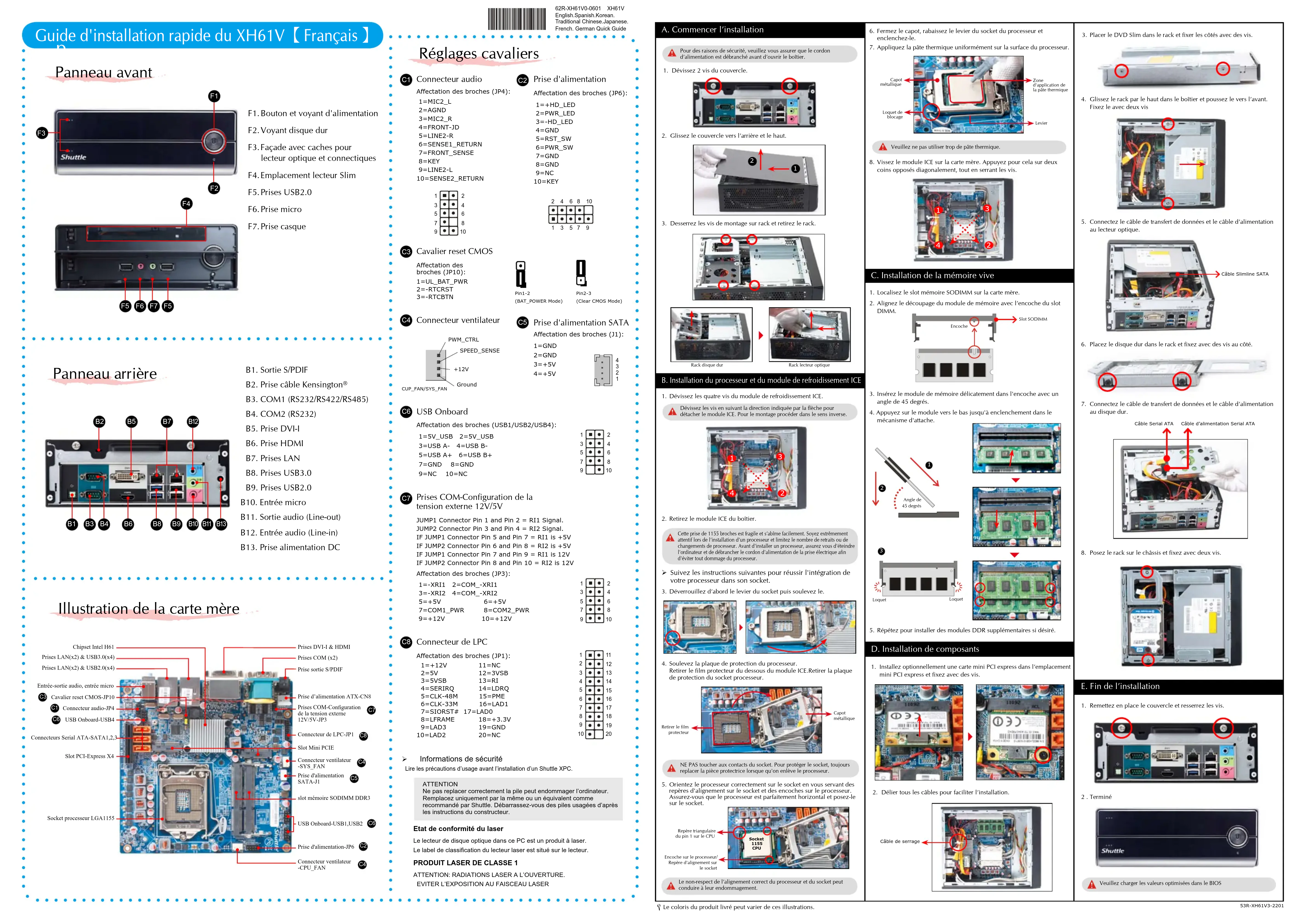 Loquet de blocageCapot métallique Zone d'application dela pâte thermiqueLevier F1. Bouton et voyant d'alimentation F2. Voyant disque dur F3. Façade avec caches pour lecteur optique et connectiques F4. Emplacement lecteur Slim F5. Prises USB2.0 F6. Prise micro F7. Prise casque B1. Sortie S/PDIF B2. Prise câble Kensington® B3. COM1 (RS232/RS422/RS485) B4. COM2 (RS232) B5. Prise DVI-I B6. Prise HDMI B7. Prises LAN B8. Prises USB3.0 B9. Prises USB2.0 B10. Entrée micro B11. Sortie audio (Line-out) B12. Entrée audio (Line-in) B13. Prise alimentation DC 62R-XH61V0-0601 XH61V English.Spanish.Korean. Traditional Chinese.Japanese. French. German Quick Guide