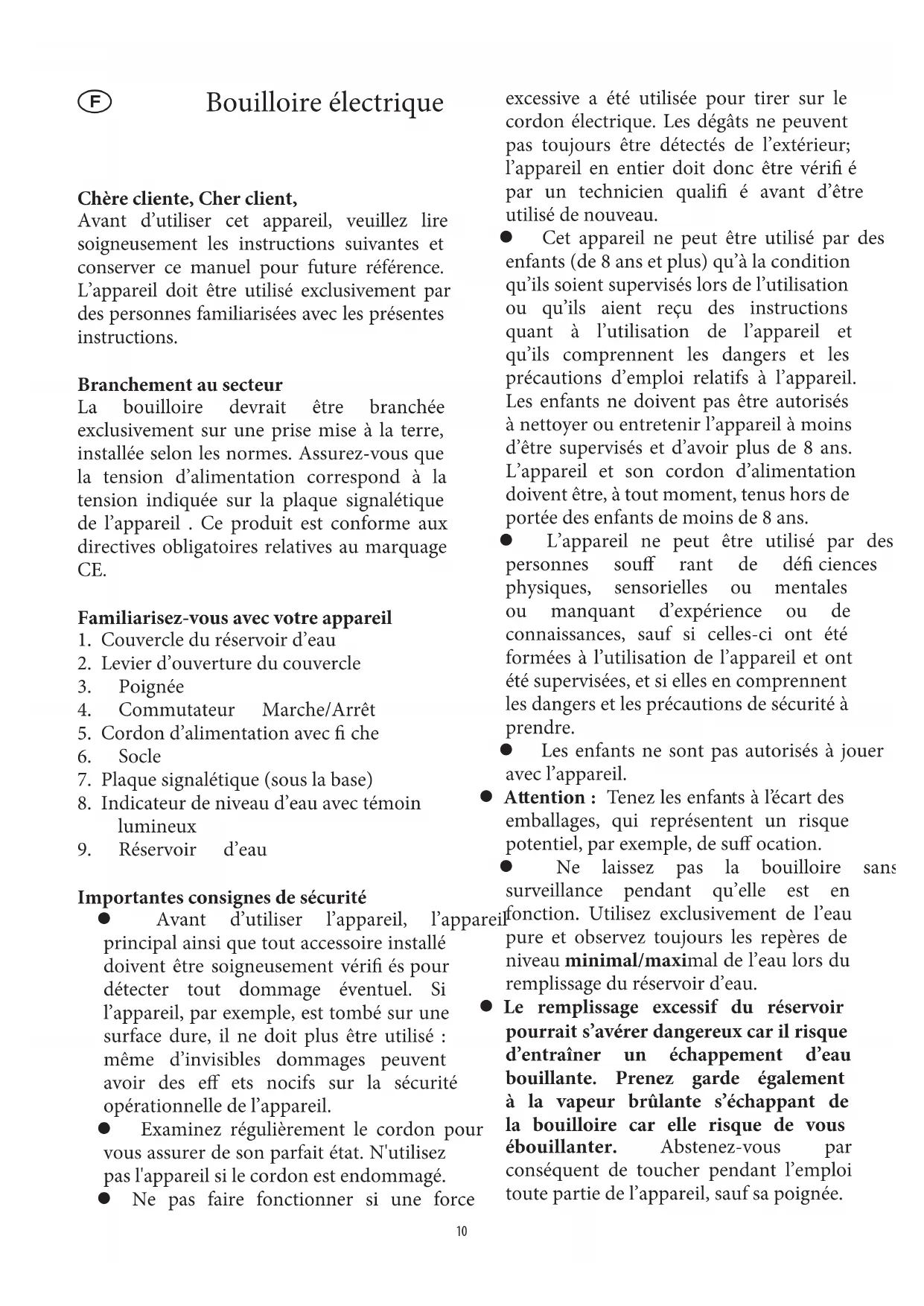 Importantes consignes de sécurité Avant d’utiliser l’appareil, l’appareil principal ainsi que tout accessoire installé doivent être soigneusement véri és pour détecter tout dommage éventuel. Si l’appareil, par exemple, est tombé sur une surface dure, il ne doit plus être utilisé : même d’invisibles dommages peuvent avoir des e ets nocifs sur la sécurité opérationnelle de l’appareil. Examinez régulièrement le cordon pour vous assurer de son parfait état. N'utilisez pas l'appareil si le cordon est endommagé. Ne pas faire fonctionner si une force excessive a été utilisée pour tirer sur le cordon électrique. Les dégâts ne peuvent pas toujours être détectés de l’extérieur; l’appareil en entier doit donc être véri é par un technicien quali é avant d’être utilisé de nouveau. Cet appareil ne peut être utilisé par des enfants (de 8 ans et plus) qu’à la condition qu’ils soient supervisés lors de l’utilisation ou qu’ils aient reçu des instructions quant à l’utilisation de l’appareil et qu’ils comprennent les dangers et les précautions d’emploi relatifs à l’appareil. Les enfants ne doivent pas être autorisés à nettoyer ou entretenir l’appareil à moins d’être supervisés et d’avoir plus de 8 ans. L’appareil et son cordon d’alimentation doivent être, à tout moment, tenus hors de portée des enfants de moins de 8 ans. L’appareil ne peut être utilisé par des personnes sou rant de dé ciences physiques, sensorielles ou mentales ou manquant d’expérience ou de connaissances, sauf si celles-ci ont été formées à l’utilisation de l’appareil et ont été supervisées, et si elles en comprennent les dangers et les précautions de sécurité à prendre. Les enfants ne sont pas autorisés à jouer avec l’appareil. Attention : Tenez les enfants à l’écart des emballages, qui représentent un risque potentiel, par exemple, de su ocation. Ne laissez pas la bouilloire sans surveillance pendant qu’elle est en fonction. Utilisez exclusivement de l’eau pure et observez toujours les repères de niveau minimal/maximal de l’eau lors du remplissage du réservoir d’eau. Le remplissage excessif du réservoir pourrait s’avérer dangereux car il risque d’entraîner un échappement d’eau bouillante. Prenez garde également à la vapeur brûlante s’échappant de la bouilloire car elle risque de vous ébouillanter. Abstenez-vous par conséquent de toucher pendant l’emploi toute partie de l’appareil, sauf sa poignée.