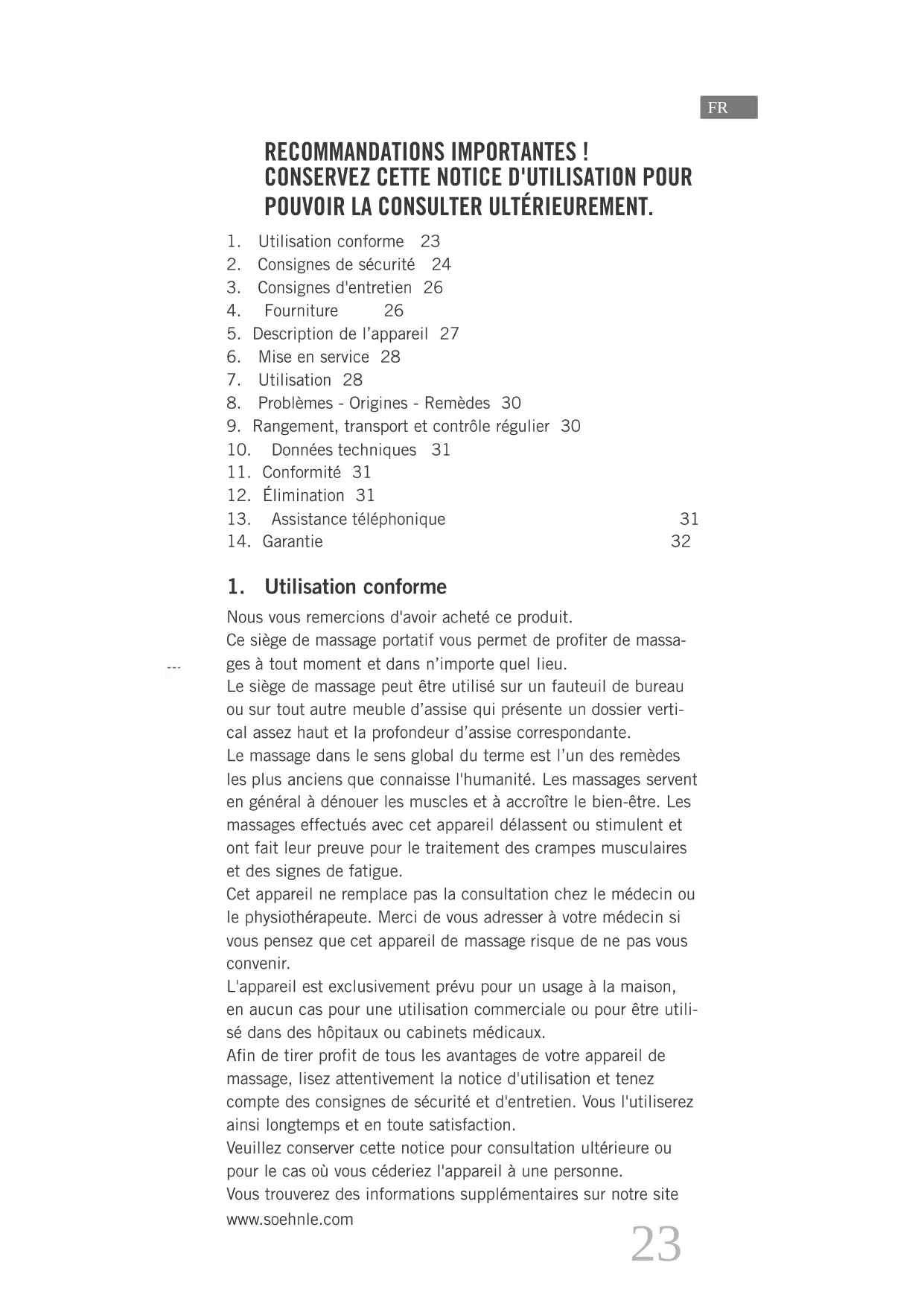 Nous vous remercions d'avoir acheté ce produit. Ce siège de massage portatif vous permet de profiter de massa- JHV¿WRXWPRPHQWHWGDQVQłLPSRUWHTXHOOLHX Le siège de massage peut être utilisé sur un fauteuil de bureau RXVXUWRXWDXWUHPHXEOHGłDVVLVHTXLSUÒVHQWHXQGRVVLHUYHUWL- cal assez haut et la profondeur d’assise correspondante. Le massage dans le sens global du terme est l’un des remèdes OHVSOXVDQFLHQVTXHFRQQDLVVHOKXPDQLWÒ/HVPDVVDJHVVHUYHQW en général à dénouer les muscles et à accroître le bien-être. Les massages effectués avec cet appareil délassent ou stimulent et ont fait leur preuve pour le traitement des crampes musculaires et des signes de fatigue. Cet appareil ne remplace pas la consultation chez le médecin ou le physiothérapeute. Merci de vous adresser à votre médecin si YRXVSHQVH]TXHFHWDSSDUHLOGHPDVVDJHULVTXHGHQHSDVYRXV convenir. L'appareil est exclusivement prévu pour un usage à la maison, en aucun cas pour une utilisation commerciale ou pour être utili- sé dans des hôpitaux ou cabinets médicaux. Afin de tirer profit de tous les avantages de votre appareil de massage, lisez attentivement la notice d'utilisation et tenez compte des consignes de sécurité et d'entretien. Vous l'utiliserez ainsi longtemps et en toute satisfaction. Veuillez conserver cette notice pour consultation ultérieure ou pour le cas où vous céderiez l'appareil à une personne. Vous trouverez des informations supplémentaires sur notre site www.soehnle.com RECOMMANDATIONS IMPORTANTES !
