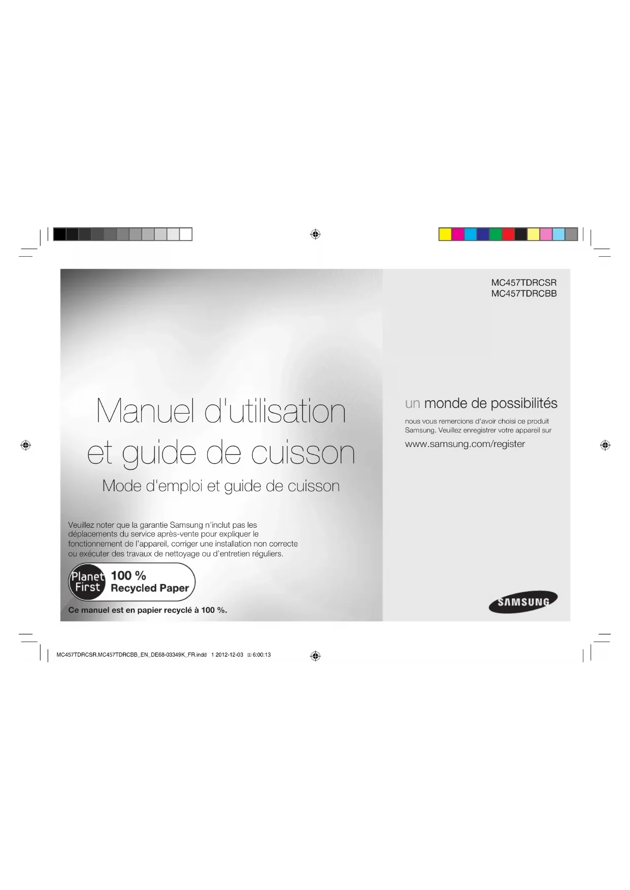 MC457TDRCSR MC457TDRCBB Ce manuel est en papier recyclé à 100 %.Veuillez noter que la garantie Samsung n’inclut pas les déplacements du service après-vente pour expliquer le fonctionnement de l’appareil, corriger une installation non correcte ou exécuter des travaux de nettoyage ou d’entretien réguliers.MC457TDRCSR,MC457TDRCBB_EN_DE68-03349K_FR.indd 1 2012-12-03 �� 6:00:132