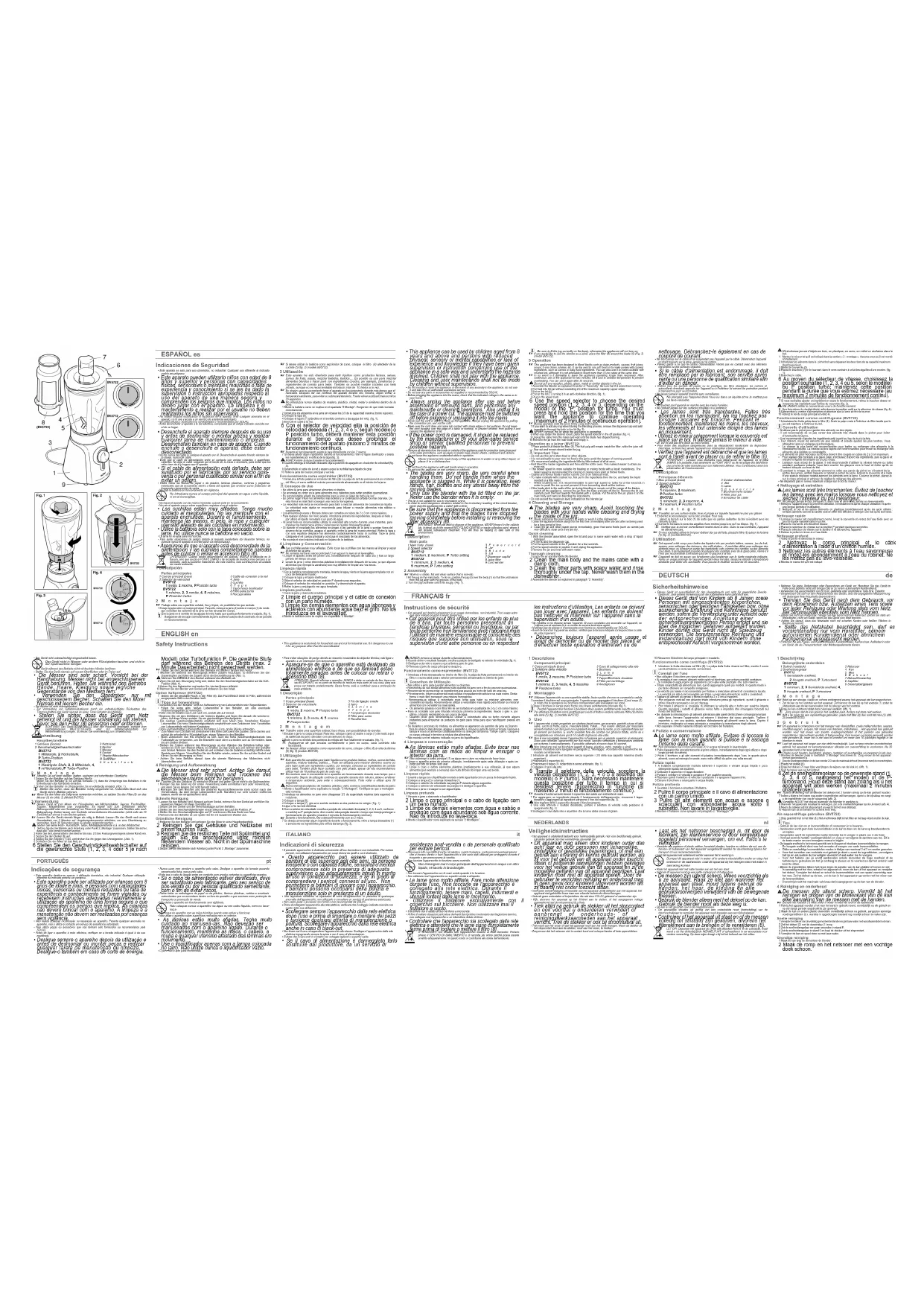 Never submerse the main body (1) in water or wash it in the dishwasher. 1 Clean the appliance before using it for the first time, immediately after use and after not being usedfor a long period of time. 2 Clean the jar and other plastic pieces immediately, given that some foods (such as carrots) are very difficult to clean once they are dry.Quick cleaning1 With the blender assembled, open the lid and pour in some warm water with a drop of liquiddetergent.2 Fit the lid and the dispenser cap.3 Put the speed selector in the P position for a few seconds. 4 Put the speed selector in position 0 and unplug the appliance.5 Remove the jar and rinse with warm water.Thorough cleaning1 Empty the jar and dismantle the blender. 2 Clean the main body and the mains cable with a damp cloth. 3 Clean the other parts with soapy water and rinse thoroughly under the tap. Never wash them in the dishwasher. 4 Assemble the blender as explained in paragraph “2. Assembly”. FRANÇAIS fr Instructions de sécurité