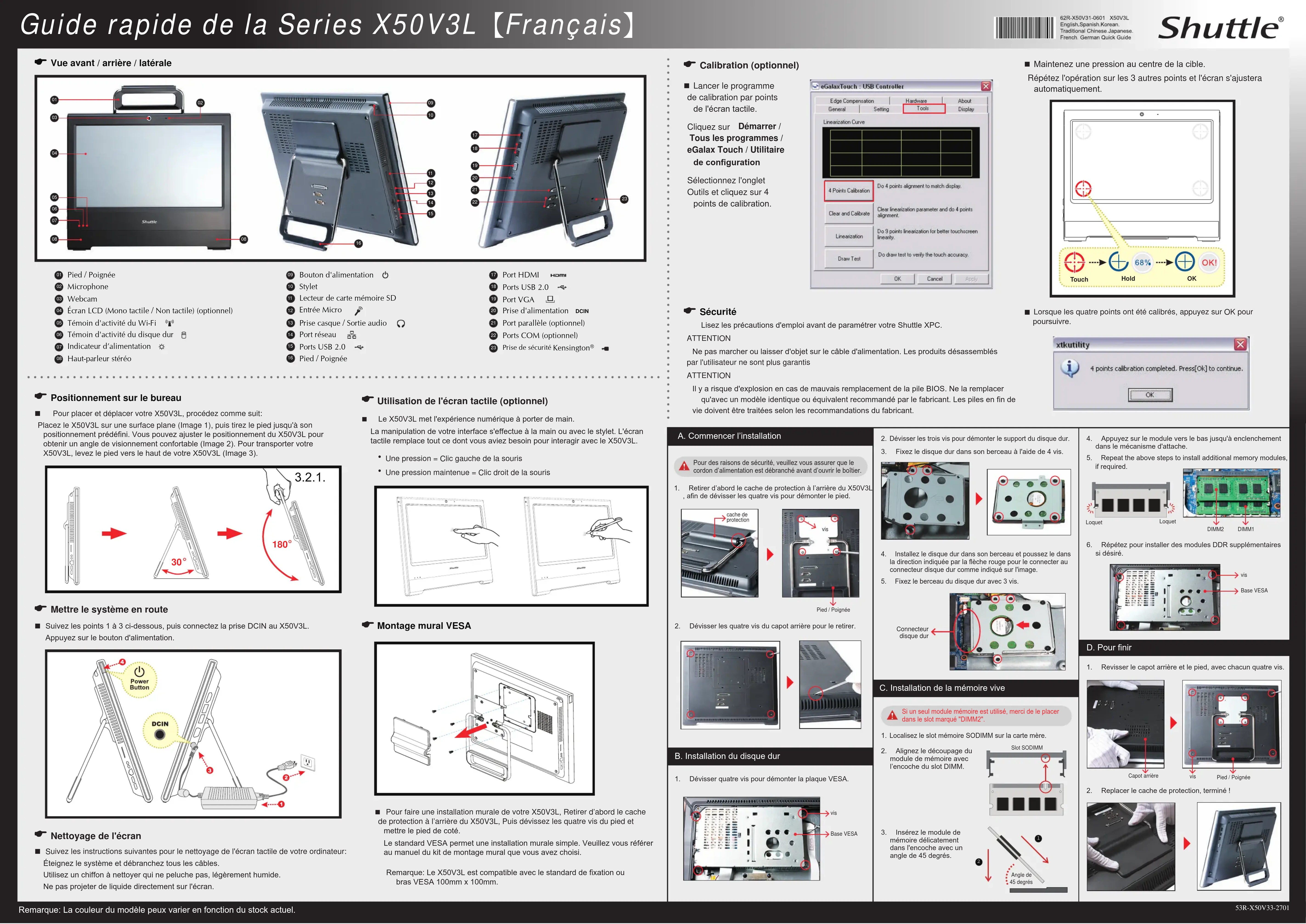 Vue avant / arrière / latérale Lancer le programme de calibration par points del'écrantactile. Cliquez sur Démarrer / Tous les programmes / eGalax Touch / Utilitaire deconguration Sélectionnez l'onglet Outils et cliquez sur 4 pointsdecalibration.
