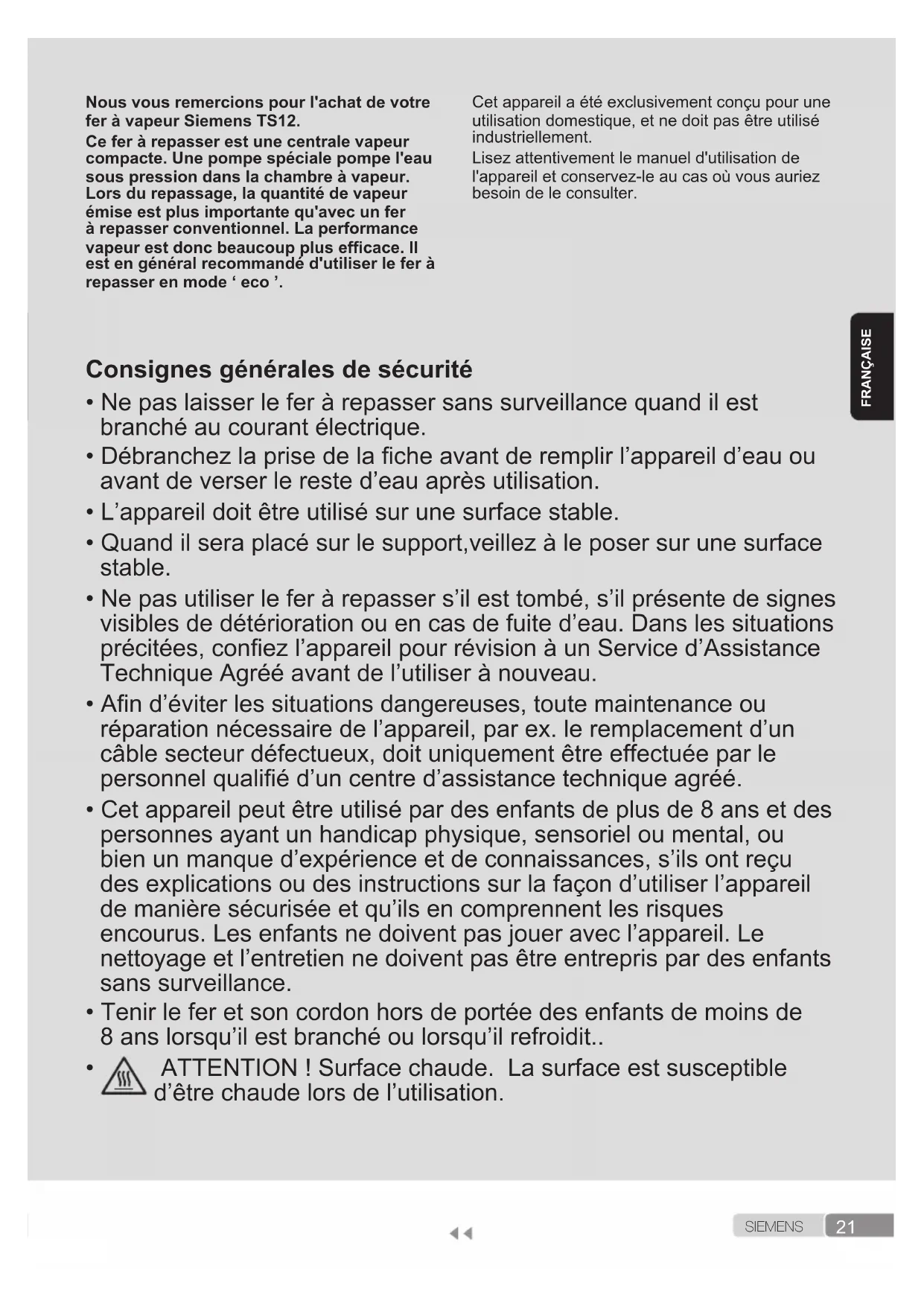 S I E M E N S FRANÇAISE Nous vous remercions pour l'achat de votre