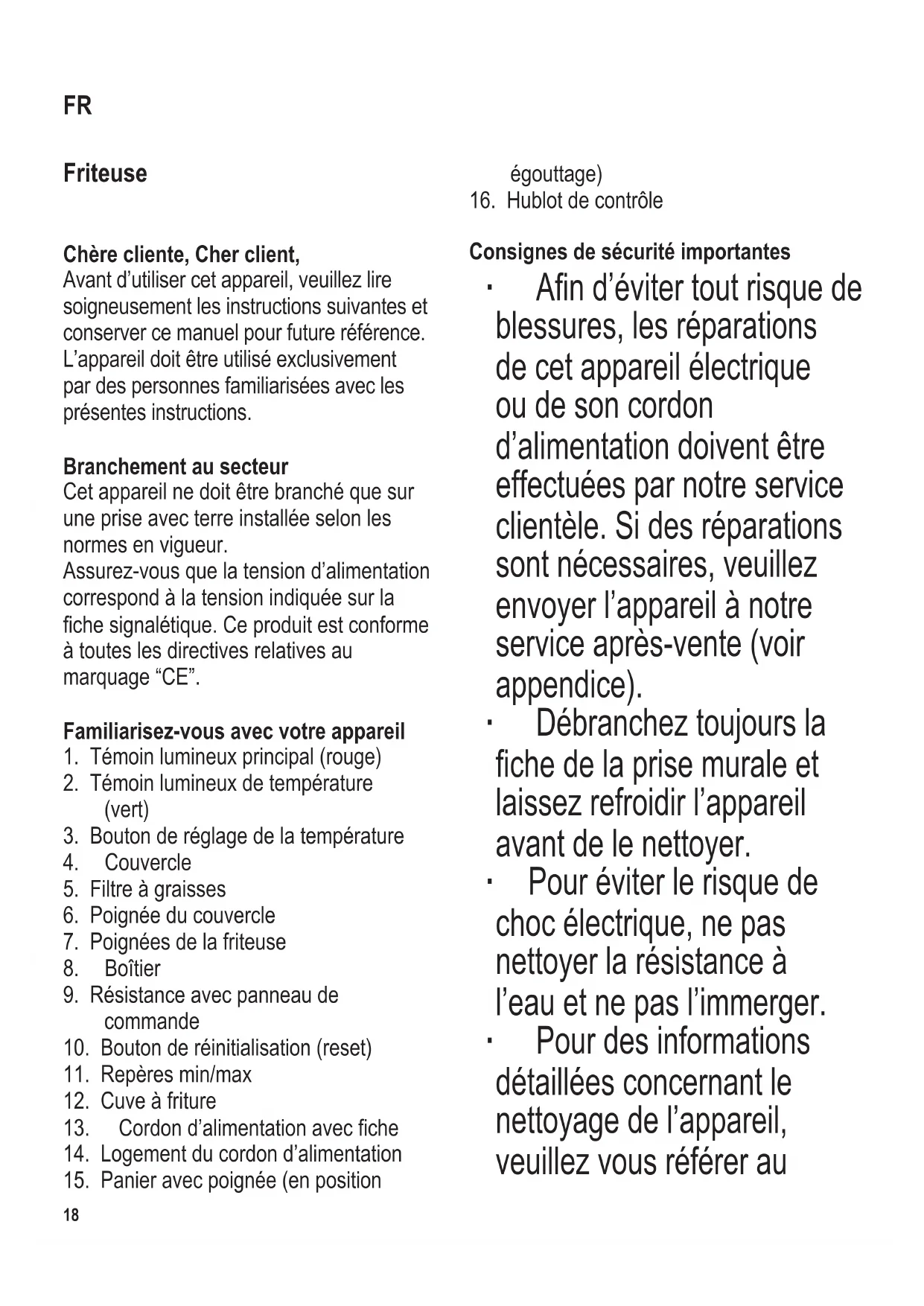 paragraphe ‘Entretien et nettoyage’. ∙ Pour éviter tout risque causé par une réinitialisation par inadvertance du coupe- circuit thermique, l’appareil ne doit pas être utilisé avec un programmateur externe, tel qu’une minuterie, et ne doit pas être branché sur un circuit activé et désactivé régulièrement par un tel programmateur. ∙ Les enfants de moins de 8 ans ne sont pas autorisés à utiliser cet appareil. ∙ Cependant, les enfants âgés de 8 ans et plus peuvent utiliser l’appareil à condition d’être surveillés en permanence. ∙ L’appareil ne peut être utilisé par des personnes souffrantdedéciences physiques, sensorielles ou mentales ou manquant d’expérience ou de connaissances, sauf si celles-ci ont été formées à l’utilisation de l’appareil et ont été supervisées, et si elles en comprennent les dangers et les précautions de sécurité à prendre. ∙ Les enfants ne sont pas autorisés à jouer avec l’appareil. ∙ Les enfants ne doivent pas être autorisés à nettoyer ou entretenir l’appareil. ∙ Avertissement ! Tenez l’appareil hors de portée des enfants (de 0 à 8 ans), tout particulièrement pendant que vous l’utilisez ou qu’il refroidit. ∙ Attention : Tenez les enfants à l’écart des emballages, qui représentent un risque potentiel, par exemple, de suffocation. ∙ Ne laissez jamais la friteuse chauffer sans huile/graisse. ∙ Ne laissez pas la friteuse sans surveillance quand elle est en20 104 x 142 mm fonctionnement. ∙ Avanttouteutilisation,vériez soigneusement que l’appareil, son cordon d’alimentation et ses accessoires ne présentent aucun signe de détérioration qui pourrait avoir un effet néfaste sur la sécurité de fonctionnement de l’appareil. Au cas où l’appareil, par exemple, serait tombé sur une surface dure, ou si une force excessive aurait été employée pour tirer sur le cordon d’alimentation, il ne doit plus être utilisé. ∙ Pour éviter que la graisse chaude n’éclabousse, servez-vous des poignées pour poser l’appareil sur une surface stable, résistant à la chaleur (imperméable aux éclaboussures et aux tâchesetquidisposedesufsamment d’espace). ∙ Ne mettez pas l’appareil sous des placards muraux ou des objets suspendus, ni directement à côté d’un mur ou dans un coin. ∙ Eviter la présence d’objets ou de matièresinammablesàproximitéde l’appareil. ∙ Ne faites jamais fondre de la graisse solidiée dans la friteuse : la résistance ne sera pas complètement submergée et peut par conséquent surchauffer, risquant de mettre le feu au contact de la graisse. ∙ L’huile/graisse trop usée risque de s’enammerquandelleestsurchauffée. Siceciseproduit,enlevezlachedela prise murale et mettez le couvercle sur l’appareiland’étoufferlesammes. Ne versez jamais d’eau sur de l’huile/ graisse chaude ou en ammes. ∙ Ne déplacez jamais l’appareil lorsqu’il est chaud, c.-à-d. en cours d’utilisation ou juste après utilisation. Soyez extrêmementprudent:l’huile/graisse chaude peut donner lieu à de graves brûlures. ∙ Attention : certains éléments de l’appareil ont tendance à chauffer pendant le fonctionnement et une vapeur dangereusement brûlante risque de s’échapper du couvercle
