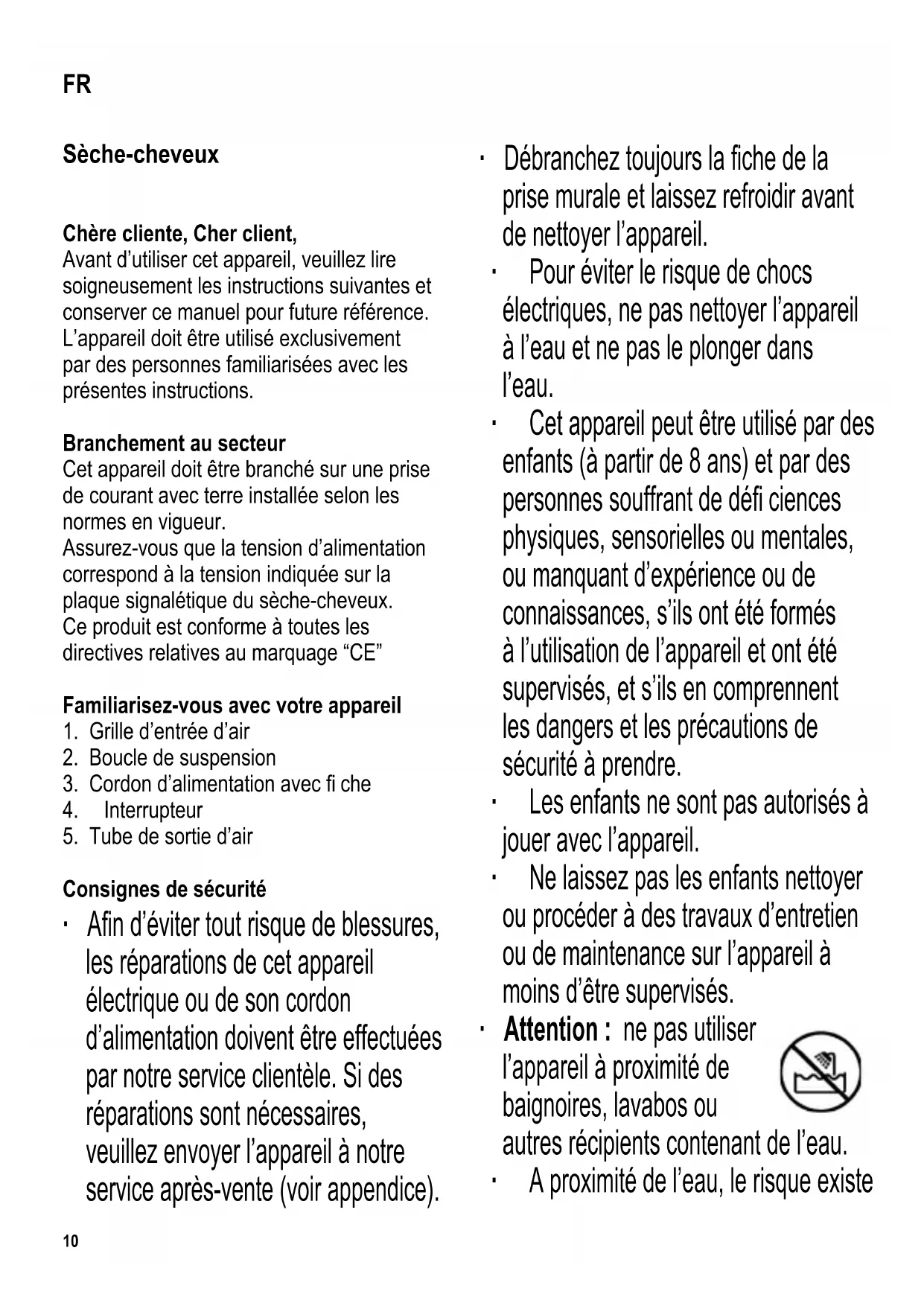 ne nettoyez pas le sèche-cheveux à l’eau