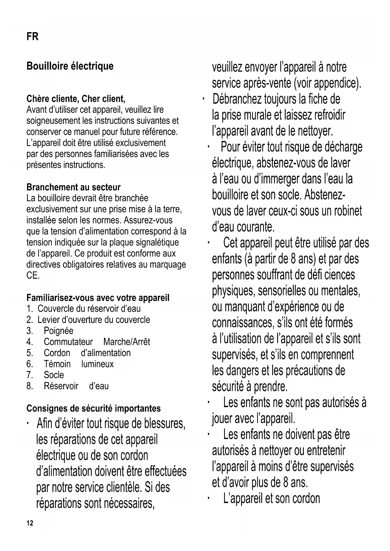 Consignes de sécurité importantes ∙ A fi n d’éviter tout risque de blessures, les réparations de cet appareil électrique ou de son cordon d’alimentation doivent être effectuées par notre service clientèle. Si des réparations sont nécessaires, veuillez envoyer l’appareil à notre service après-vente (voir appendice). ∙ Débranchez toujours la fi che de la prise murale et laissez refroidir l’appareil avant de le nettoyer. ∙ Pour éviter tout risque de décharge électrique, abstenez-vous de laver à l’eau ou d’immerger dans l’eau la bouilloire et son socle. Abstenez- vous de laver ceux-ci sous un robinet d’eau courante. ∙ Cet appareil peut être utilisé par des enfants (à partir de 8 ans) et par des personnes souffrant de défi ciences physiques, sensorielles ou mentales, ou manquant d’expérience ou de connaissances, s’ils ont été formés à l’utilisation de l’appareil et s’ils sont supervisés, et s’ils en comprennent les dangers et les précautions de sécurité à prendre. ∙ Les enfants ne sont pas autorisés à jouer avec l’appareil. ∙ Les enfants ne doivent pas être autorisés à nettoyer ou entretenir l’appareil à moins d’être supervisés et d’avoir plus de 8 ans. ∙ L’appareil et son cordon FR13 d’alimentation doivent être, à tout moment, tenus hors de portée des enfants de moins de 8 ans. ∙ Cet appareil est destiné à une utilisation domestique ou similaire, telle que - dans des bureaux et autres locaux commerciaux, - dans des organisations agricoles, - par la clientèle dans les hôtels, motels et établissements similaires, - et dans des maisons d’hôtes. ∙ Ne laissez pas la bouilloire sans surveillance pendant qu’elle est en fonction. Utilisez exclusivement de l’eau pure et observez toujours les repères de niveau minimal/maximal de l’eau lors du remplissage du réservoir d’eau. Le remplissage excessif du réservoir pourrait s’avérer dangereux car il risque d’entraîner un échappement d’eau bouillante. ∙ Prenez garde également à la vapeur brûlante s’échappant de la bouilloire car elle risque de vous ébouillanter. Abstenez-vous par conséquent de toucher pendant l’emploi toute partie de l’appareil, sauf sa poignée. ∙ Attention ! Le couvercle doit toujours rester fermé pendant le processus d’ébullition et lorsque vous versez l’eau bouillante. ∙ La bouilloire sera utilisée exclusivement avec le socle fourni. ∙ N’enlevez jamais de son socle (ou remettez en place) le réservoir d’eau quand l’appareil est branché. ∙ Attention : Tenez les enfants à l’écart des emballages, qui représentent un risque potentiel, par exemple, de suffocation. ∙ Avant toute utilisation, vérifi ez soigneusement que l’appareil, son cordon d’alimentation et ses accessoires ne présentent aucun signe de détérioration qui pourrait avoir un effet néfaste sur la sécurité de fonctionnement de l’appareil. Au cas où l’appareil, par exemple, serait tombé sur une surface dure, ou si une force excessive aurait été employée pour tirer sur le cordon d’alimentation, il ne doit plus être utilisé. ∙ L’appareil sera utilisé exclusivement sur une surface plane, résistante à la chaleur. ∙ Ne pas utiliser l’appareil sous un placard mural ou autre objet similaire, au risque de bloquer le bon échappement de la vapeur. ∙ Les surfaces extérieures deviennent chaudes pendant l’utilisation et le restent quelque temps après. ∙ Ne permettez jamais que le boîtier ou le cordon d’alimentation entre en contact avec aucune fl amme ou surface chaude14 telle qu’une plaque chauffante. ∙ Ne laissez pas pendre le cordon d’alimentation et tenez-le à l’abri des parties chaudes du boîtier. ∙ Débranchez toujours la fi che de la prise murale - après l’emploi, - en cas de fonctionnement défectueux, - avant de nettoyer l’appareil. ∙ Aucune responsabilité n’est acceptée en cas de dégâts dus à une mauvaise utilisation ou si on ne se conforme pas à ces consignes. Coupure thermique automatique Le dispositif de coupure automatique préréglé protège l’élément chauffant contre toute surchauffe au cas où l’appareil serait mis en circuit à sec ou l’élément chauffant serait entartré. Une fois que le dispositif de coupure automatique l’aura éteinte, la bouilloire, avant d’être rallumée, devra refroidir ou sera soumise à un détartrage. Avant la première utilisation Pour assurer une propreté totale, faites bouillir de l’eau et jetez celle-ci après le premier cycle d’ébullition. Ebullition de l’eau ∙ Retirez le réservoir d’eau de son socle. ∙ Appuyez sur le levier d’ouverture du couvercle, ouvrez le couvercle et remplissez le réservoir d’eau jusqu’au niveau désiré en respectant les repères de remplissage Min. et Max. ∙ Refermez le couvercle et posez le réservoir sur son socle. ∙ Branchez la fi che sur une prise murale appropriée et abaissez le commutateur Marche/Arrêt; le témoin s’allumera. ∙ La mise à ébullition commence. Lorsque le point d’ébullition est atteint, le dispositif intégré d’arrêt automatique arrête l’appareil ; le témoin lumineux s’éteindra. ∙ Si vous voulez interrompre le processus de mise à ébullition, réglez le commutateur Marche/Arrêt en position Arrêt. ∙ Pour verser l’eau bouillante, retirez le réservoir de son socle. ∙ Pour empêcher l’échappement de la vapeur brûlante, veillez à maintenir le couvercle fermé pendant que vous versez l’eau. ∙ Après utilisation, débranchez la fi che de la prise murale (le voyant rouge s’éteint). ∙ Ne laissez pas d’eau dans le réservoir. Logement du câble d’alimentation Le logement du câble d’alimentation prévu sous le socle permet de gérer facilement la longueur du câble d’alimentation pendant l’emploi, ainsi que de ranger l’appareil en toute commodité. Détartrage ∙ Selon la