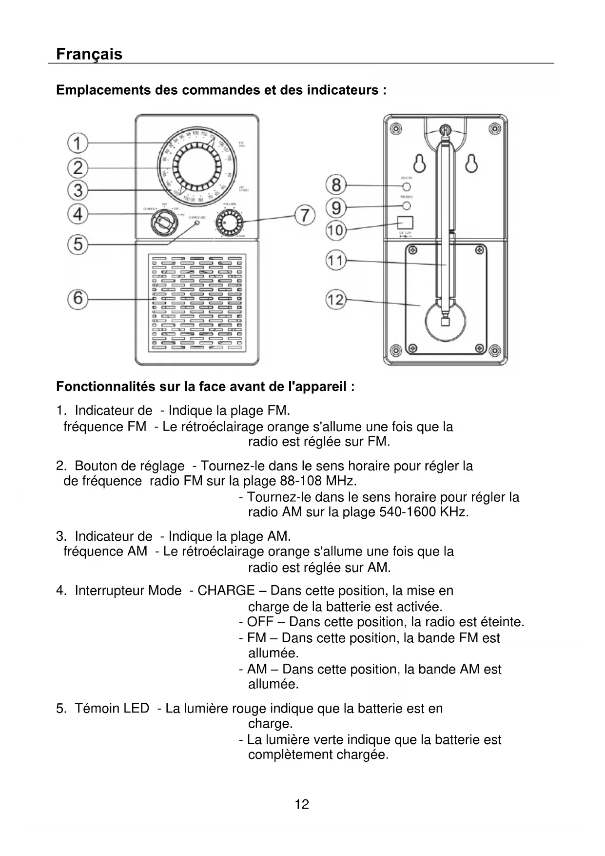 - Veuillez noter que la réception de la radio s'affaiblit et que le son peut être déformé lorsque la batterie a besoin d'être chargée.