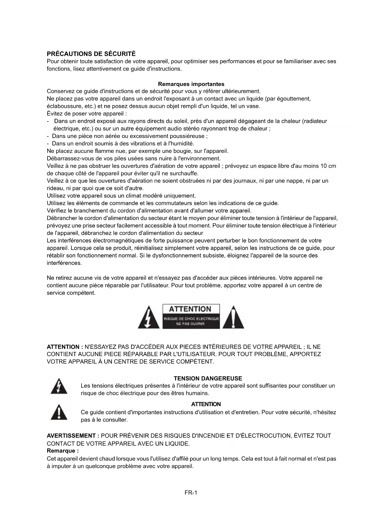 AVERTISSEMENT: POUR PRÉVENIR DES RISQUES D'INCENDIE ET D'ÉLECTROCUTION, ÉVITEZ TOUT CONTACT DE VOTRE APPAREIL AVEC UN LIQUIDE.