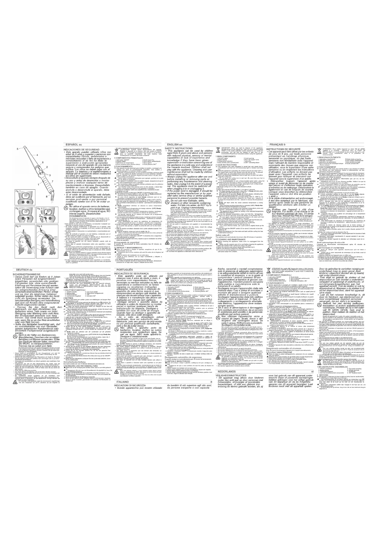 Ready-Max clignote jusqu'à ce que le fer soit à cette température.Si vous souhaitez obtenir directement la température maximale,maintenez le sélecteur de température + appuyé pendant près de 3secondes. L'appareil dispose d'un système de verrouillage de la température sélectionnée Lock System.5 Pour verrouiller la température sélectionnée, maintenez le sélecteur detempérature - appuyé pendant près de 3 secondes. Un verrou s'affiche àl'écran (fig. 3). Pour déverrouiller les sélecteurs de température (3), maintenez de nouveau le sélecteur de température - appuyé pendant près de 3secondes.6 Enroulez la mèche de cheveux autour de la forme conique, encommençant par la partie la plus épaisse et tenez la pointe des cheveuxavec l'autre main. (fig. 4)7 Laissez la mèche enroulée autour de la partie chaude pendant 5-10secondes. 8 Faites des ondes sur toute la chevelure (fig. 5). Pour une coiffure plus informelle, cassez légèrement les boucles à l'aide d'un peigne squelette.9 Maintenez l'interrupteur marche/arrêt (1) appuyé pendant 2 sec pourdéconnecter l'appareil.10 Débranchez ensuite l’appareil et attendez qu’il refroidisse avant de leranger. Arrêt automatique de sécurité L'appareil se déconnectera automatiquement après 45 minutes defonctionnement.