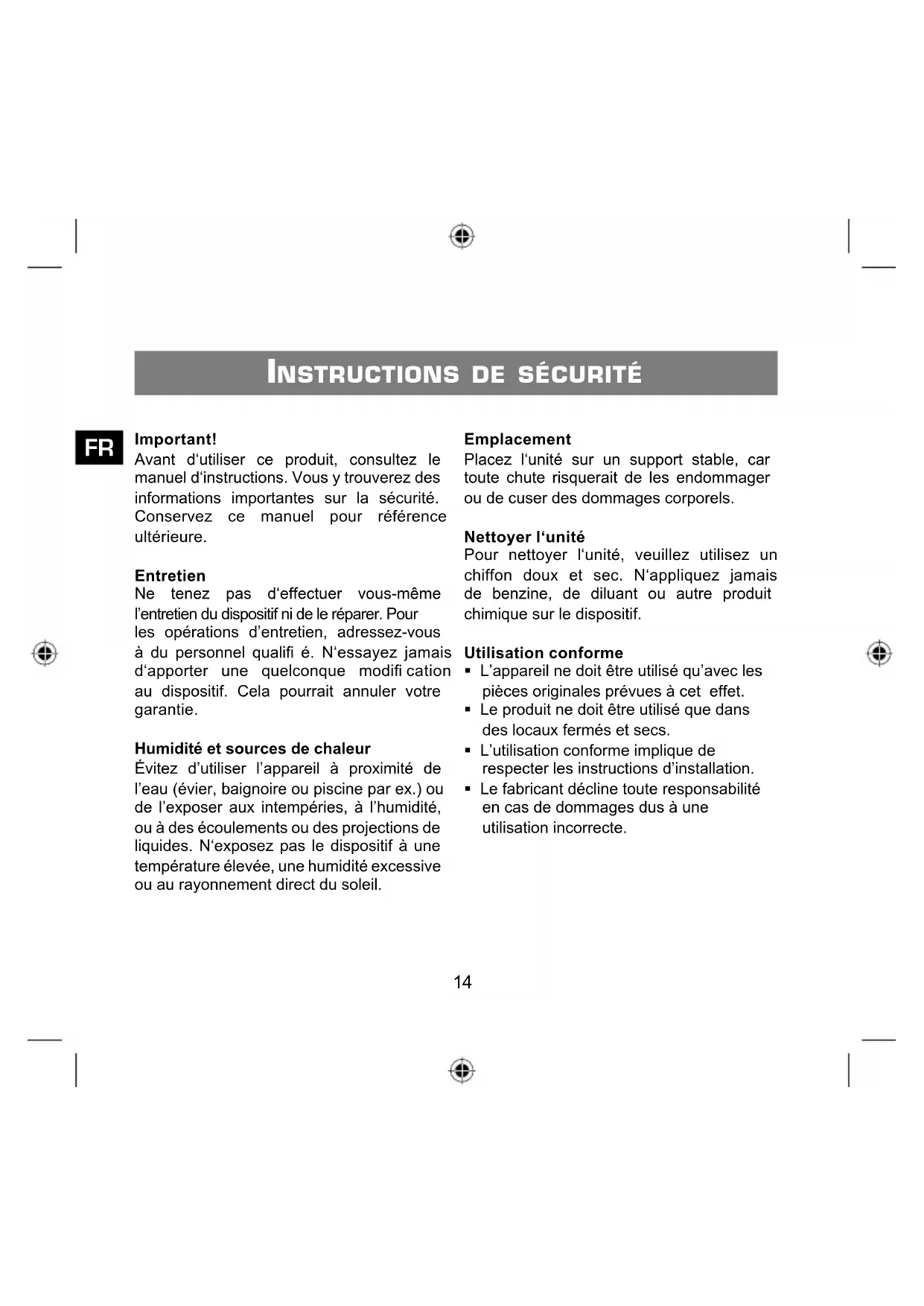 Important! Avant d‘utiliser ce produit, consultez le manuel d‘instructions. Vous y trouverez des informations importantes sur la sécurité. Conservez ce manuel pour référence ultérieure. Entretien Ne tenez pas d‘effectuer vous-même l’entretien du dispositif ni de le réparer. Pour les opérations d’entretien, adressez-vous à du personnel qualifi é. N‘essayez jamais d‘apporter une quelconque modifi cation au dispositif. Cela pourrait annuler votre garantie. Humidité et sources de chaleur Évitez d’utiliser l’appareil à proximité de l’eau (évier, baignoire ou piscine par ex.) ou de l’exposer aux intempéries, à l’humidité, ou à des écoulements ou des projections de liquides. N‘exposez pas le dispositif à une température élevée, une humidité excessive ou au rayonnement direct du soleil. Emplacement Placez l‘unité sur un support stable, car toute chute risquerait de les endommager ou de cuser des dommages corporels. Nettoyer l‘unité Pour nettoyer l‘unité, veuillez utilisez un chiffon doux et sec. N‘appliquez jamais de benzine, de diluant ou autre produit chimique sur le dispositif. Utilisation conforme L’appareil ne doit être utilisé qu’avec les pièces originales prévues à cet effet. Le produit ne doit être utilisé que dans des locaux fermés et secs. L’utilisation conforme implique de respecter les instructions d’installation. Le fabricant décline toute responsabilité en cas de dommages dus à une utilisation incorrecte.