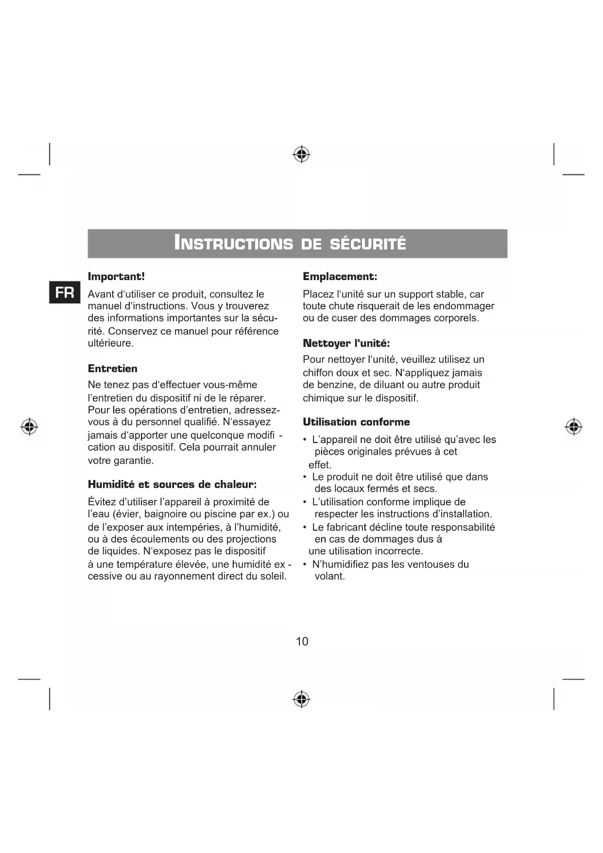 Important! Avant d‘utiliser ce produit, consultez le manuel d‘instructions. Vous y trouverez des informations importantes sur la sécu- rité. Conservez ce manuel pour référence ultérieure. Entretien Ne tenez pas d‘effectuer vous-même l’entretien du dispositif ni de le réparer. Pour les opérations d’entretien, adressez- vous à du personnel qualifié. N‘essayez jamais d‘apporter une quelconque modifi