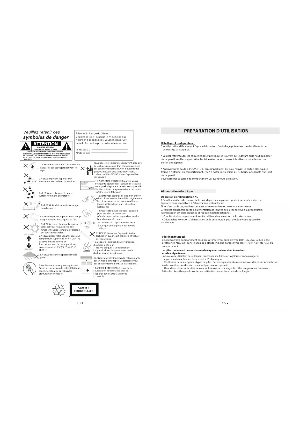 17.Risque d'exploration si la pile est emplacée par un modulo inadapte DeBarrassez-vous des piles conformément aux instructions. 18.APPAREIL ENFICHABLE: La prise de courant doit être installée pres de l'appareil et doit être facilement accessible.