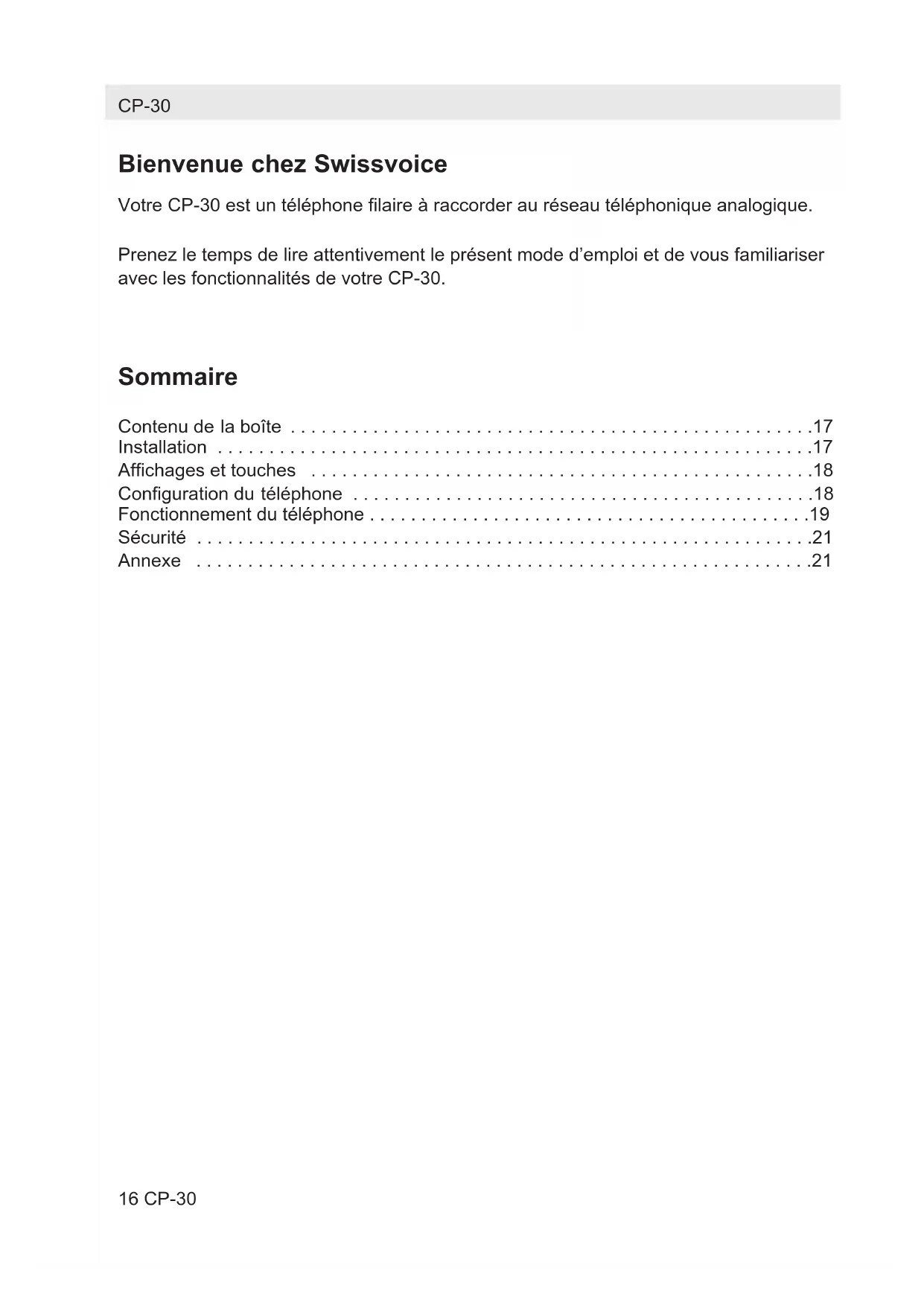 Retrouvez gratuitement la notice de l'appareil CP30 SWISSVOICE au format PDF.