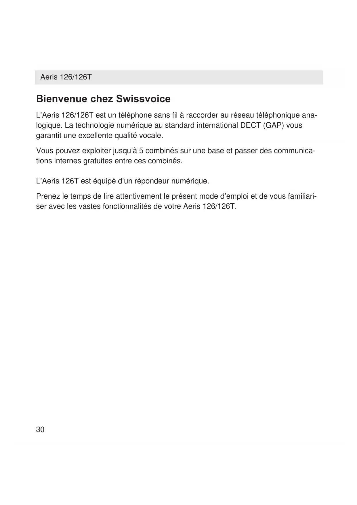 Aeris 126/126TBienvenue chez Swissvoice L’Aeris 126/126T est un téléphone sans fil à raccorder au réseau téléphonique ana- logique. La technologie numérique au standard international DECT (GAP) vous garantit une excellente qualité vocale. Vous pouvez exploiter jusqu’à 5 combinés sur une base et passer des communica- tions internes gratuites entre ces combinés. L’Aeris 126T est équipé d’un répondeur numérique. Prenez le temps de lire attentivement le présent mode d’emploi et de vous familiari- ser avec les vastes fonctionnalités de votre Aeris 126/126T. Aeris 126/126T 30Swissvoice Votre Aeris 126/126T dispose de la dernière innovation en terme de réduction de radiations électromagnétiques (également connue sous l’appellation «electro- smog»), ainsi qu’en terme de réduction de consommation d’énergie. Swissvoice englobe 3 caractéristiques principales: Multi Handset Low Radiation Mode En mode veille les radiations électromagnétiques sont complètement coupées sur la station de base ainsi que sur tous les combinés déclarés à celle-ci. La station de base et les combinés attendent un signal d’activation, qui est produit lors d’un appel entrant ou si l’un des combinés est activé par l’utilisateur ou lorsque le système syn- chronise des données. En d’autres termes, le système génère des radiations électromagnétiques uniquement lorsque celui-ci est en fonctionnement. Réduction des radiations en communication Lorsque vous vous trouvez à proximité de la base avec un combiné, les radiations électromagnétiques sont réduites jusqu’à 65%. La puissance transmise par les combinés est automatiquement réduite au niveau le plus bas en fonction de la dis- tance avec la station de base. Réduction de la consommation d’énergie Grâce à l’utilisation de composants modernes, les adaptateurs secteurs actuels peuvent permettre de réduire considérablement la consommation d’énergie, par rapport aux adaptateurs conventionnels. Combiné à la Réduction des radiations en communication et au Multi Handset Low Radiation Mode, il contribue à réduire la consommation d’énergie et également le coût d’exploitation.