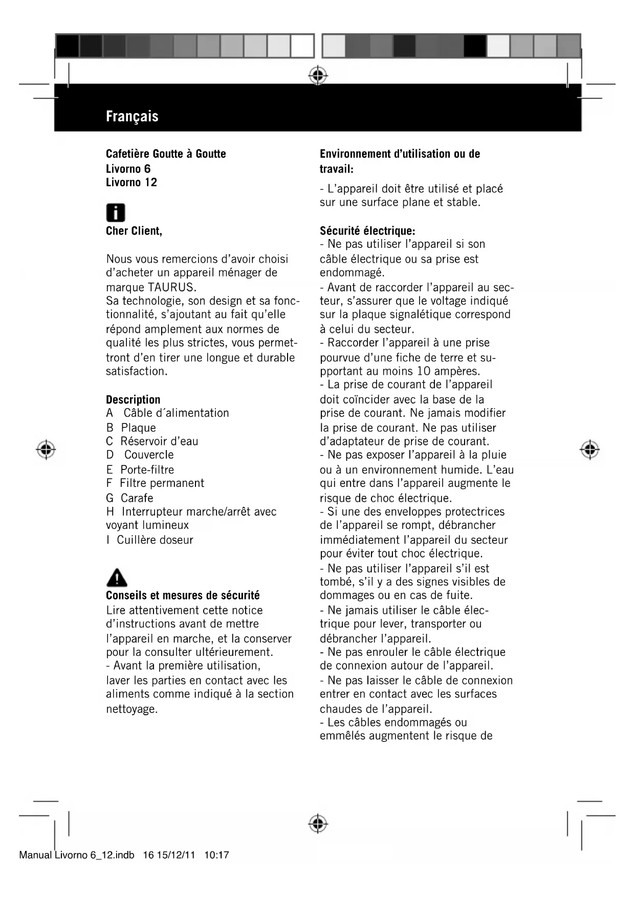 Retrouvez gratuitement la notice de l'appareil Livorno 12 TAURUS au format PDF.
