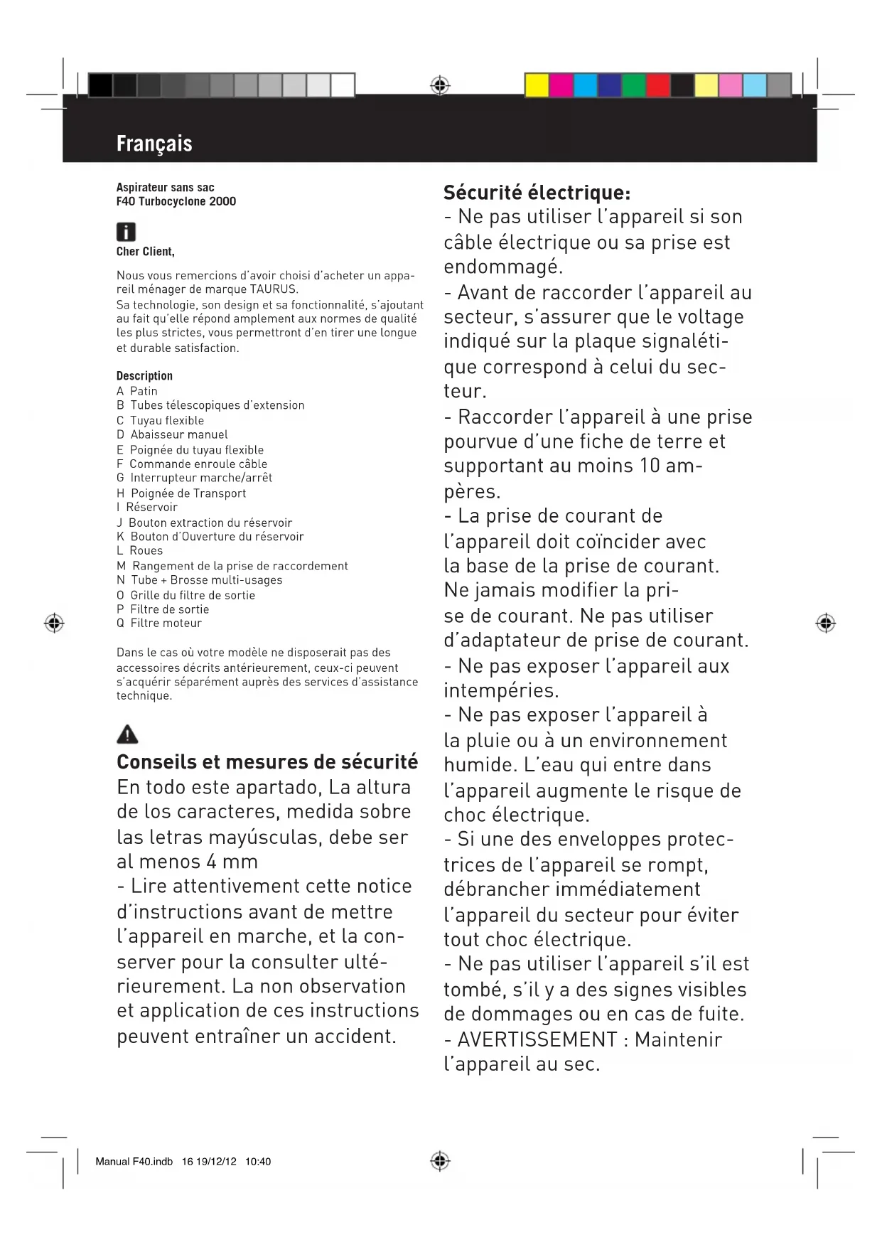 Retrouvez gratuitement la notice de l'appareil F40 Turbocyclone 2000 TAURUS au format PDF.