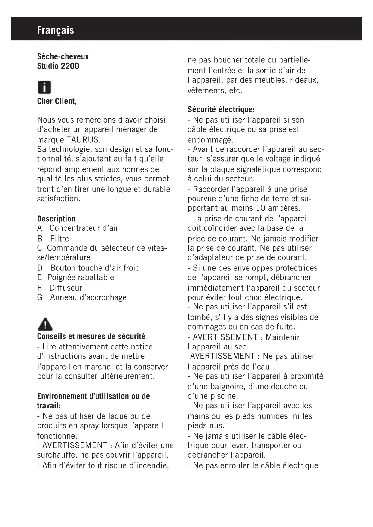 Studio 2200 - Sèche cheveux TAURUS - Notice d'utilisation et mode d'emploi gratuit