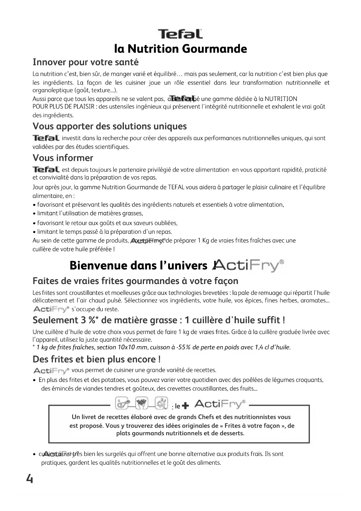 fig. 2 fig. 3la Nutrition Gourmande Innover pour votre santé La nutrition c’est, bien sûr, de manger varié et équilibré… mais pas seulement, car la nutrition c’est bien plus que les ingrédients. La façon de les cuisiner joue un rôle essentiel dans leur transformation nutritionnelle et organoleptique (goût, texture...). Aussi parce que tous les appareils ne se valent pas, a développé une gamme dédiée à la NUTRITIONPOUR PLUS DE PLAISIR : des ustensiles ingénieux qui préservent l’intégrité nutritionnelle et exhalent le vrai goûtdes ingrédients. Vous apporter des solutions uniques investit dans la recherche pour créer des appareils aux performances nutritionnelles uniques, qui sontvalidées par des études scientifiques. Vous informer est depuis toujours le partenaire privilégié de votre alimentation en vous apportant rapidité, praticitéet convivialité dans la préparation de vos repas.Jour après jour, la gamme Nutrition Gourmande de TEFAL vous aidera à partager le plaisir culinaire et l’équilibrealimentaire, en :• favorisant et préservant les qualités des ingrédients naturels et essentiels à votre alimentation,• limitant l'utilisation de matières grasses,• favorisant le retour aux goûts et aux saveurs oubliées,• limitant le temps passé à la préparation d'un repas.Au sein de cette gamme de produits, vous permet de préparer 1 Kg de vraies frites fraîches avec unecuillère de votre huile préférée ! Bienvenue dans l’univers ! Faites de vraies frites gourmandes à votre façon Les frites sont croustillantes et moelleuses grâce aux technologies brevetées : la pale de remuage qui répartit l'huile délicatement et l'air chaud pulsé. Sélectionnez vos ingrédients, votre huile, vos épices, fines herbes, aromates... s'occupe du reste. Seulement 3 %* de matière grasse : 1 cuillère d'huile suffit ! Une cuillère d'huile de votre choix vous permet de faire 1 kg de vraies frites. Grâce à la cuillère graduée livrée avec l’appareil, utilisez la juste quantité nécessaire. * 1 kg de frites fraîches, section 10x10 mm, cuisson à -55% de perte en poids avec 1,4 cl d’huile. Des frites et bien plus encore ! vous permet de cuisiner une grande variété de recettes.• En plus des frites et des potatoes, vous pouvez varier votre quotidien avec des poêlées de légumes croquants,des émincés de viandes tendres et goûteux, des crevettes croustillantes, des fruits...