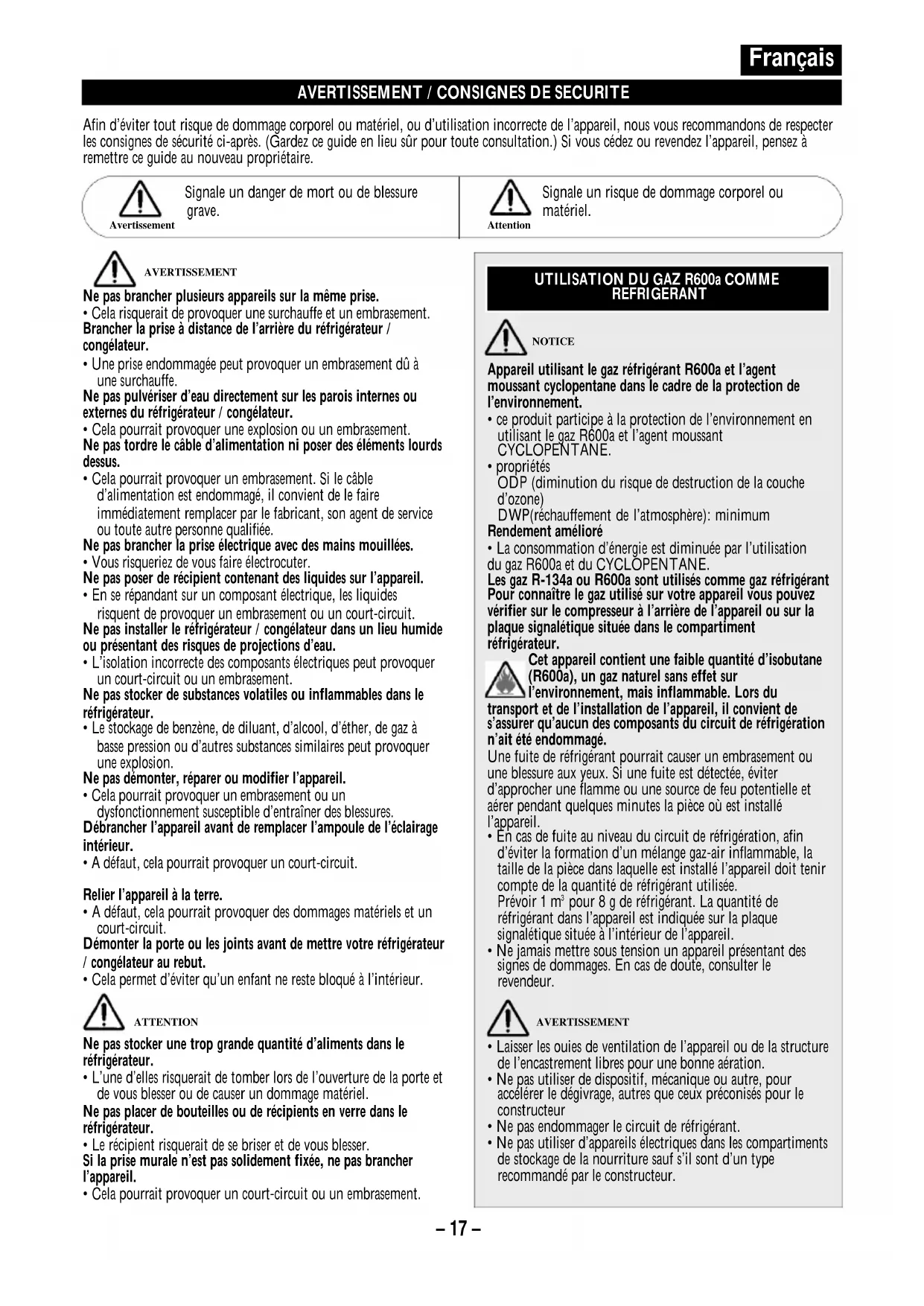 Cet appareil contient une faible quantité d'isobutane (R600a), un gaz naturel sans effet sur l'environnement, mais inflammable. Lors du