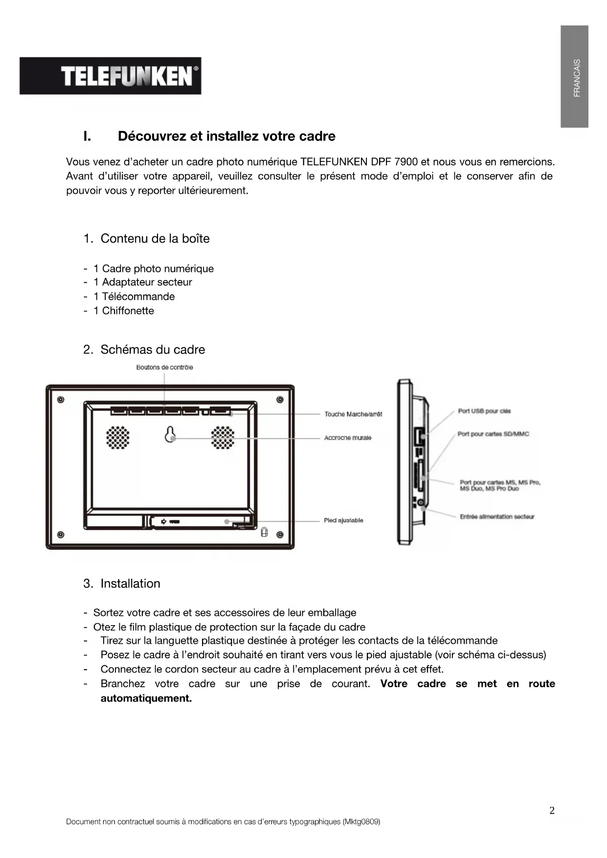 Vous venez d’acheter un cadre photo numérique TELEFUNKEN DPF 7900 et nous vous en remercions. Avant d’utiliser votre appareil, veuillez consulter le présent mode d’emploi et le conserver afin de pouvoir vous y reporter ultérieurement.