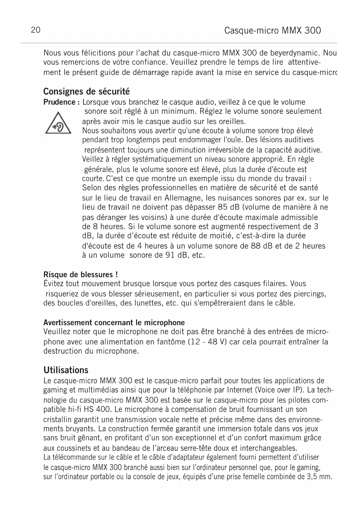 Nous vous félicitions pour l’achat du casque-micro MMX 300 de beyerdynamic. Nous vous remercions de votre confiance. Veuillez prendre le temps de lire attentive- ment le présent guide de démarrage rapide avant la mise en service du casque-micro. Consignes de sécurité Prudence : Lorsque vous branchez le casque audio, veillez à ce que le volume sonore soit réglé à un minimum. Réglez le volume sonore seulement après avoir mis le casque audio sur les oreilles. Nous souhaitons vous avertir qu'une écoute à volume sonore trop élevé pendant trop longtemps peut endommager l'ouïe. Des lésions auditives représentent toujours une diminution irréversible de la capacité auditive. Veillez à régler systématiquement un niveau sonore approprié. En règle générale, plus le volume sonore est élevé, plus la durée d'écoute est courte. C’est ce que montre un exemple issu du monde du travail : Selon des règles professionnelles en matière de sécurité et de santé sur le lieu de travail en Allemagne, les nuisances sonores par ex. sur le lieu de travail ne doivent pas dépasser 85 dB (volume de manière à ne pas déranger les voisins) à une durée d'écoute maximale admissible de8heures. Si le volume sonore est augmenté respectivement de 3 dB, la durée d’écoute est réduite de moitié, c’est-à-dire la durée d'écoute est de 4 heures à un volume sonore de 88 dB et de 2 heures à un volume sonore de 91 dB, etc.