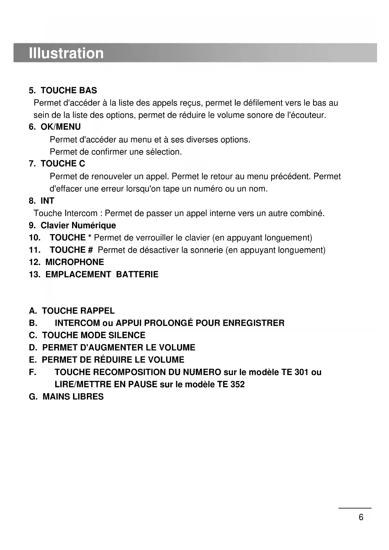 E. PERMET DE RÉDUIRE LE VOLUME F. TOUCHE RECOMPOSITION DU NUMERO sur le modèle TE 301 ou LIRE/METTRE EN PAUSE sur le modèle TE 352